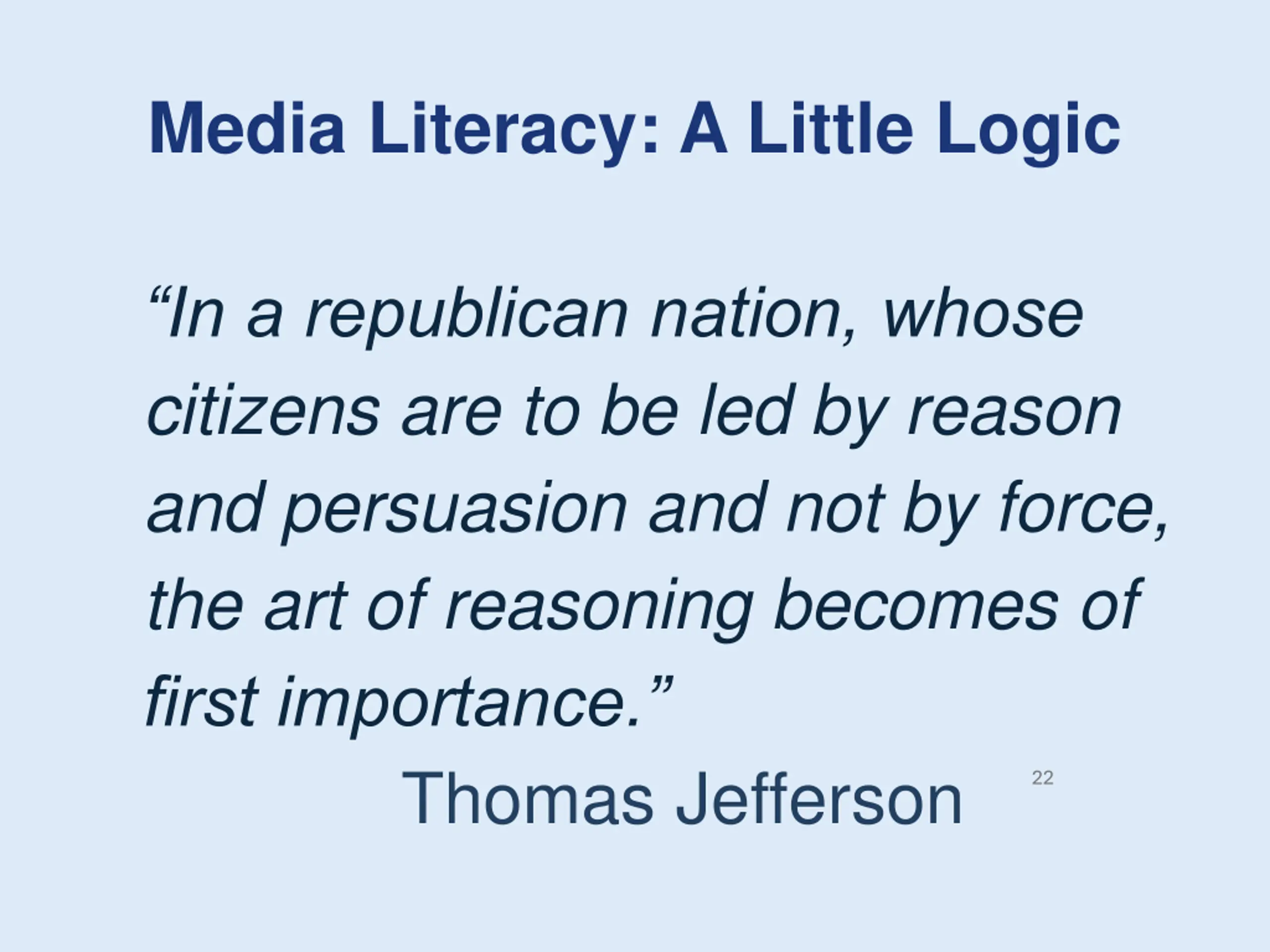 Media Literacy: A Little Logic In a republican nation, whose citizens are to be led by reason and persuasion and not by force, the art of reasoning becomes of first importance. Thomas Jefferson 22