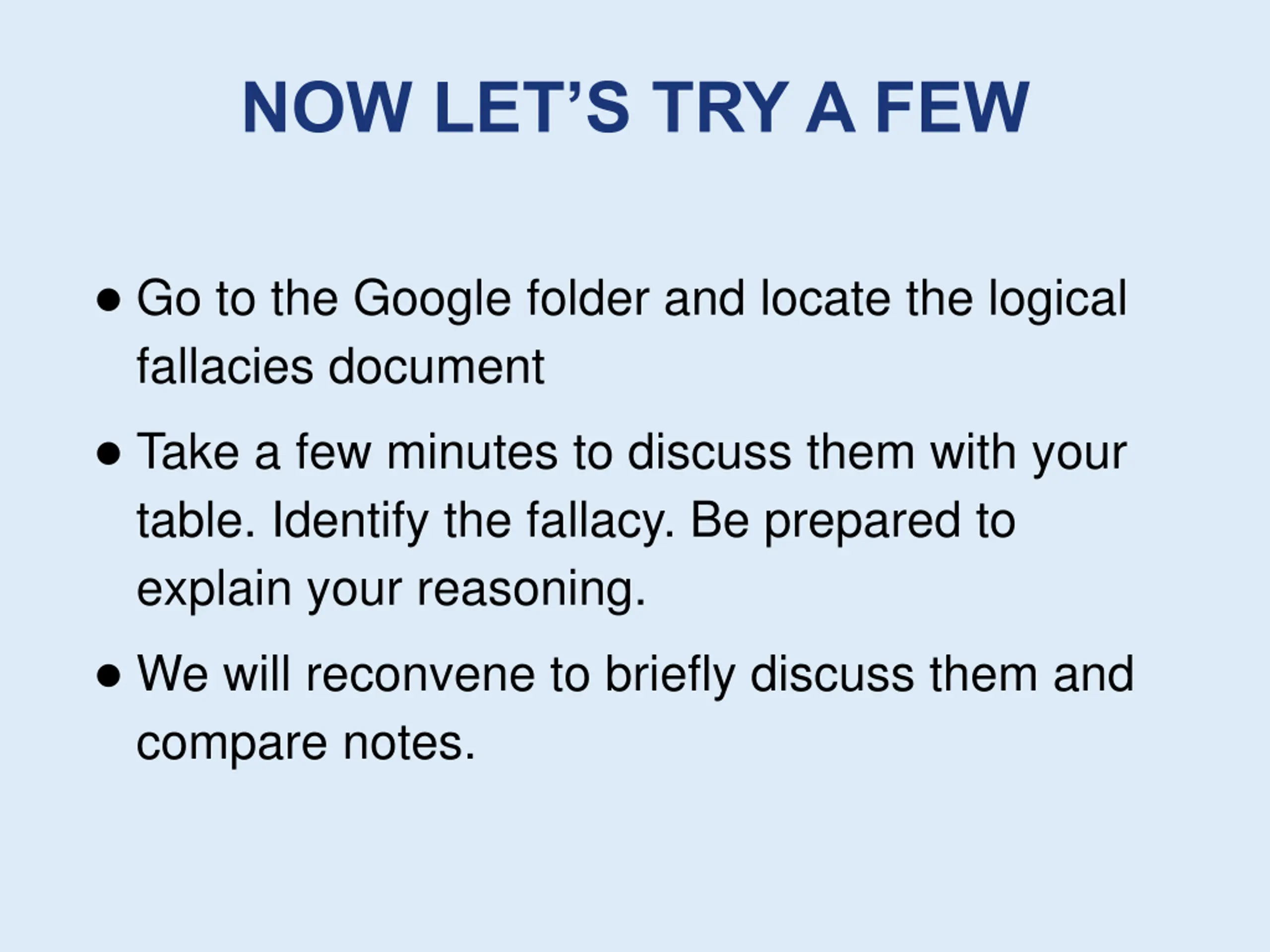 NOW LETS TRY A FEW Go to the Google folder and locate the logical fallacies document Take a few minutes to discuss them with your table. Identify the fallacy. Be prepared to explain your reasoning. We will reconvene to briefly discuss them and compare notes.