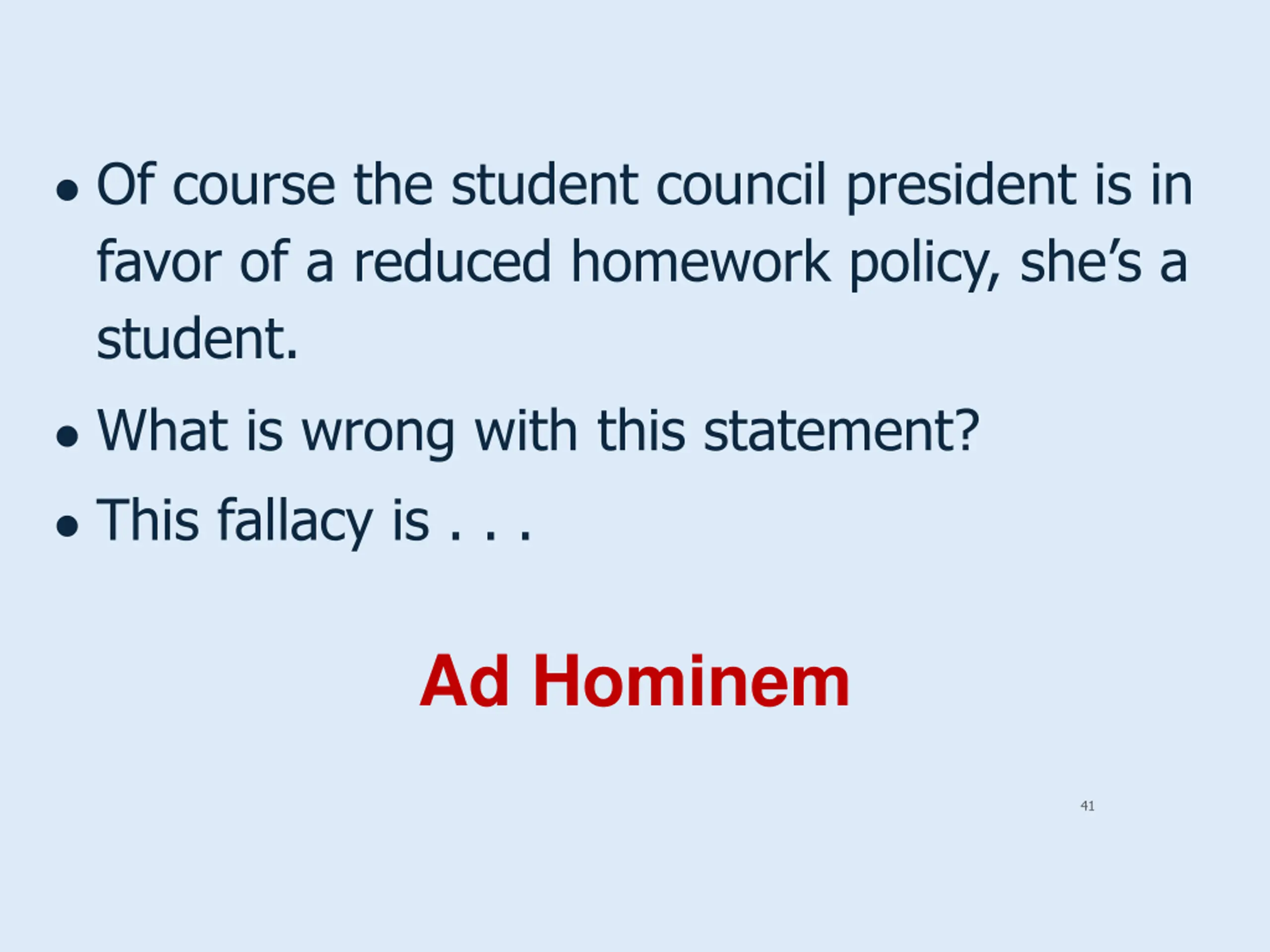 Of course the student council president is in favor of a reduced homework policy, she s a student. What is wrong with this statement? This fallacy is . . . Ad Hominem 41