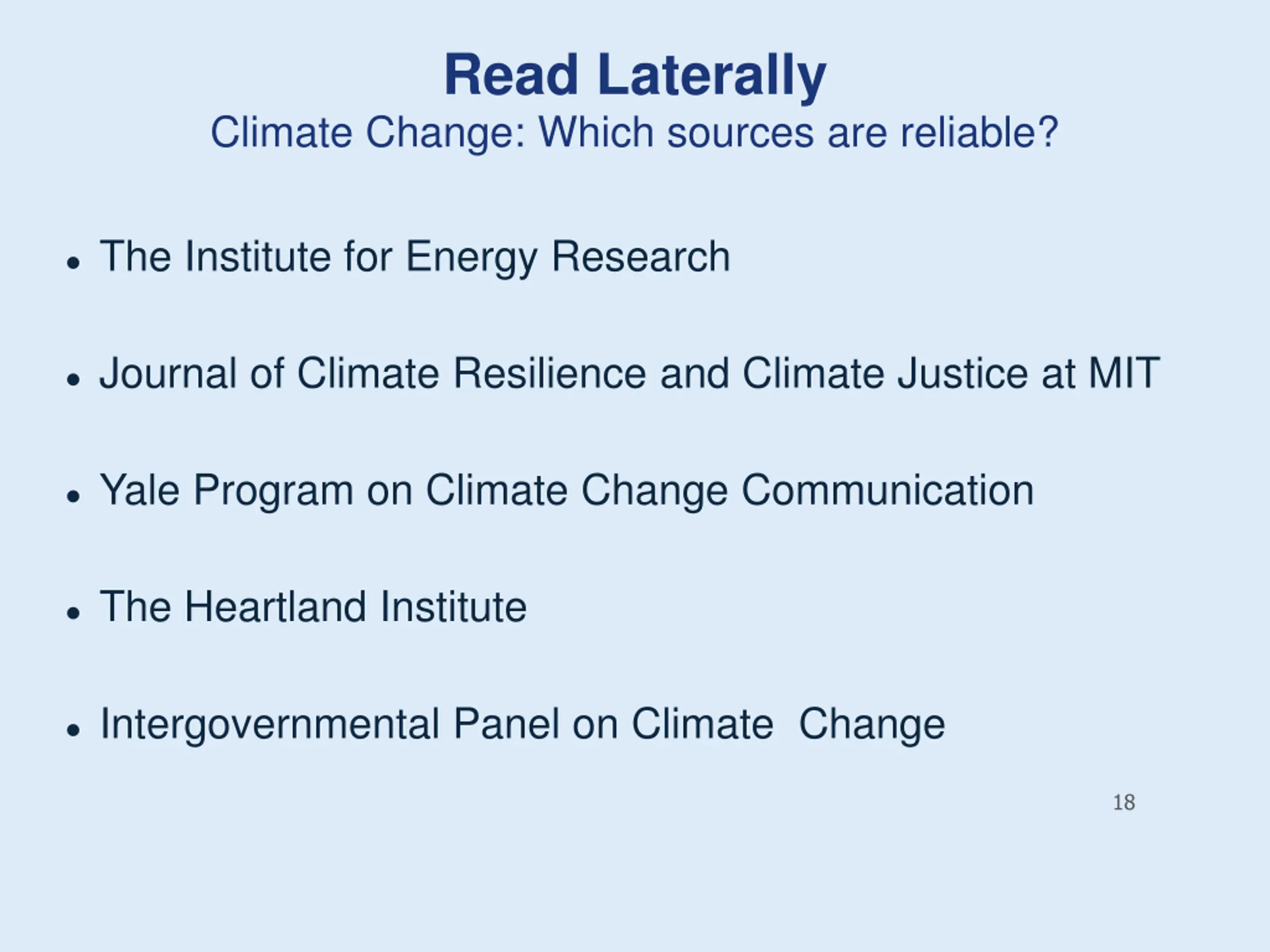 Read Laterally Climate Change: Which sources are reliable? The Institute for Energy Research Journal of Climate Resilience and Climate Justice at MIT Yale Program on Climate Change Communication The Heartland Institute Intergovernmental Panel on Climate Change 18