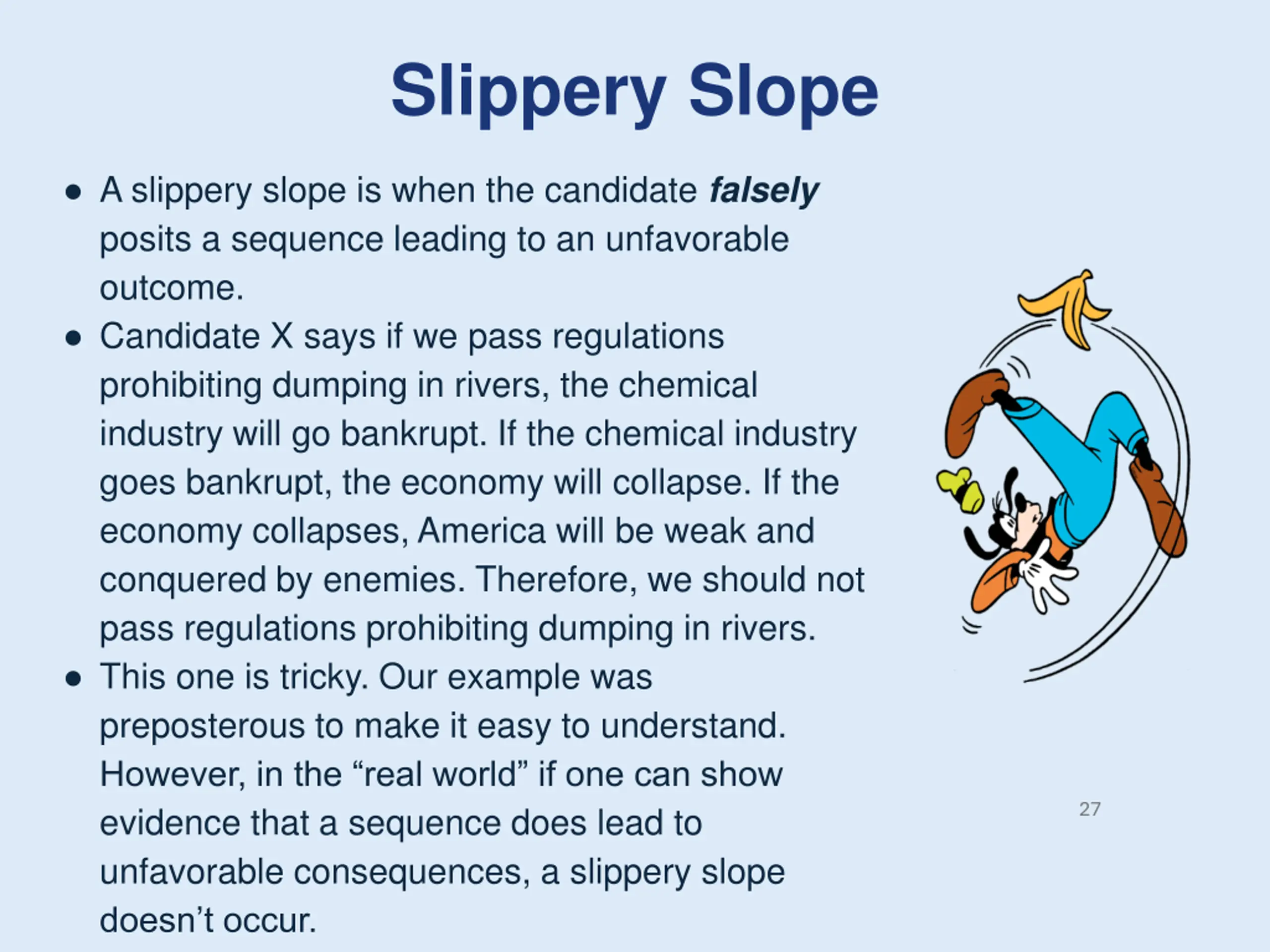 Slippery Slope A slippery slope is when the candidate falsely posits a sequence leading to an unfavorable outcome. Candidate X says if we pass regulations prohibiting dumping in rivers, the chemical industry will go bankrupt. If the chemical industry goes bankrupt, the economy will collapse. If the economy collapses, America will be weak and conquered by enemies. Therefore, we should not pass regulations prohibiting dumping in rivers. This one is tricky. Our example was preposterous to make it easy to understand. However, in the real world if one can show evidence that a sequence does lead to unfavorable consequences, a slippery slope doesn t occur. 27