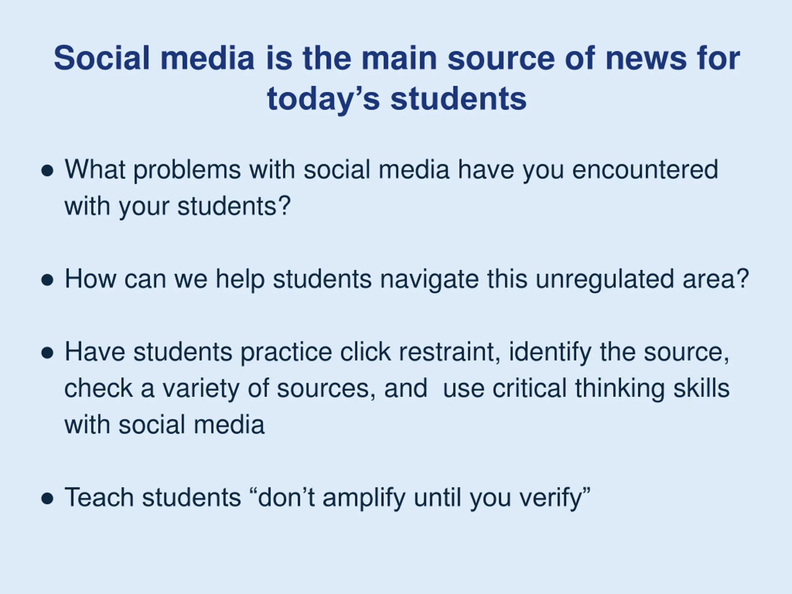 Social mediais the main source of news for today s students What problems with social media have you encountered with your students? How can we help students navigate this unregulated area? Have students practice click restraint, identify the source, check a variety of sources, and use critical thinking skills with social media Teach students don t amplify until you verify