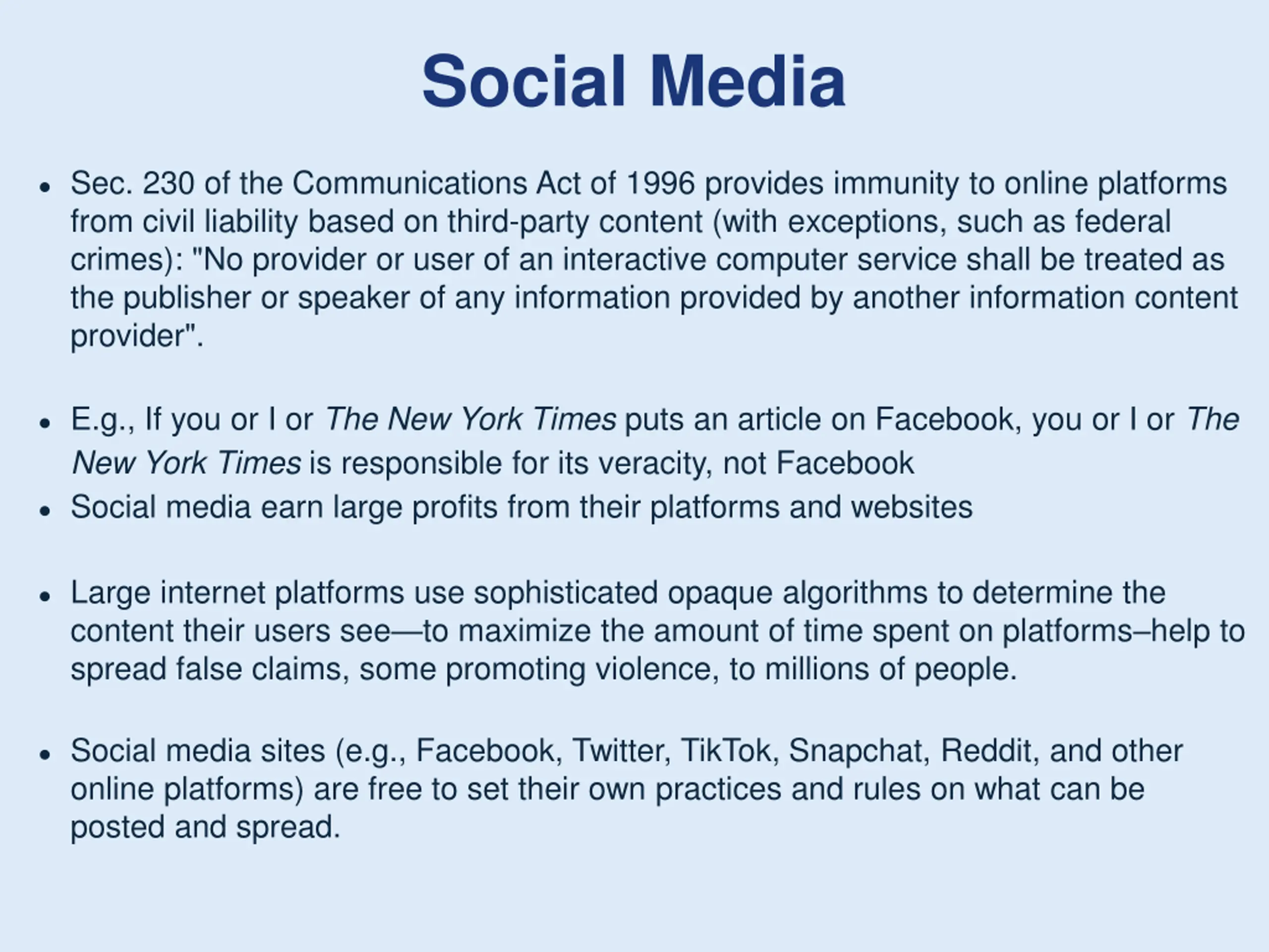 Social Media Sec. 230 of the Communications Act of 1996 provides immunity to online platforms from civil liability based on third-party content (with exceptions, such as federal crimes): "No provider or user of an interactive computer service shall be treated as the publisher or speaker of any information provided by another information content provider". E.g., If you or I or The New York Times puts an article on Facebook, you or I or The New York Times is responsible for its veracity, not Facebook Social media earn large profits from their platforms and websites Large internet platforms use sophisticated opaque algorithms to determine the content their users see to maximize the amount of time spent on platforms help to spread false claims, some promoting violence, to millions of people. Social media sites (e.g., Facebook, Twitter, TikTok, Snapchat, Reddit, and other online platforms) are free to set their own practices and rules on what can be posted and spread.