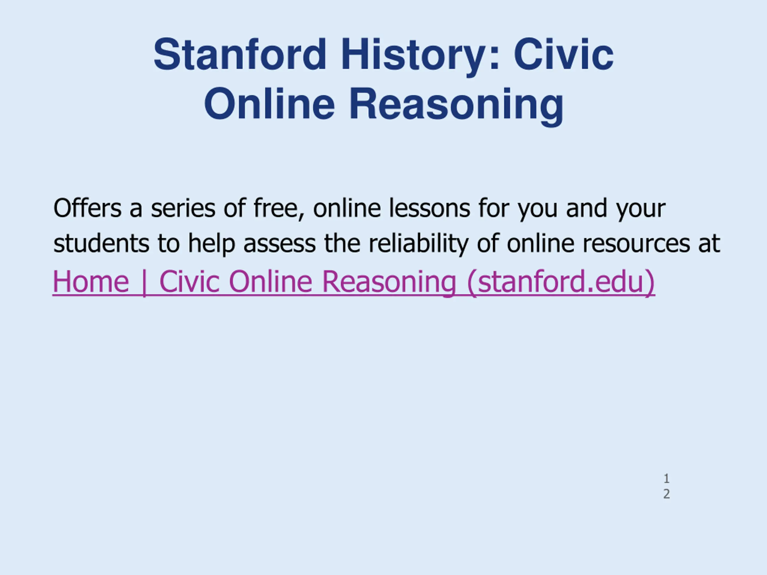 Stanford History: Civic Online Reasoning Offers a series of free, online lessons for you and your students to help assess the reliability of online resources at Home | Civic Online Reasoning (stanford.edu) 1 2