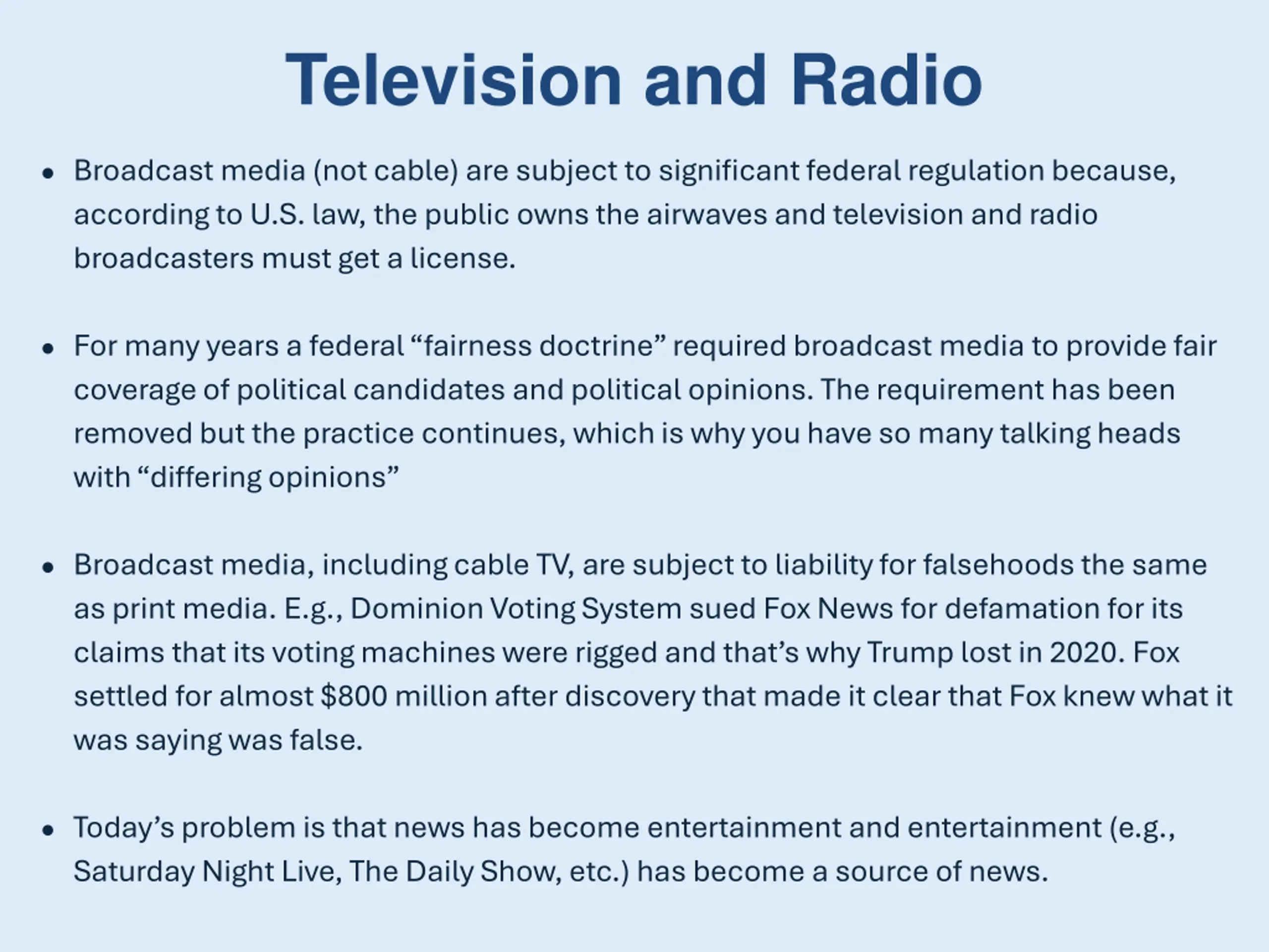 Television and Radio Broadcast media (not cable) are subject to significant federal regulation because, according to U.S. law, the public owns the airwaves and television and radio broadcasters must get a license. For many years a federal fairness doctrine required broadcast media to provide fair coverage of political candidates and political opinions. The requirement has been removed but the practice continues, which is why you have so many talking heads with differing opinions Broadcast media, including cable TV, are subject to liability for falsehoods the same as print media. E.g., Dominion Voting System sued Fox News for defamation for its claims that its voting machines were rigged and that s why Trump lost in 2020. Fox settled for almost $800 million after discovery that made it clear that Fox knew what it was saying was false. Today s problem is that news has become entertainment and entertainment (e.g., Saturday Night Live, The Daily Show, etc.) has become a source of news.