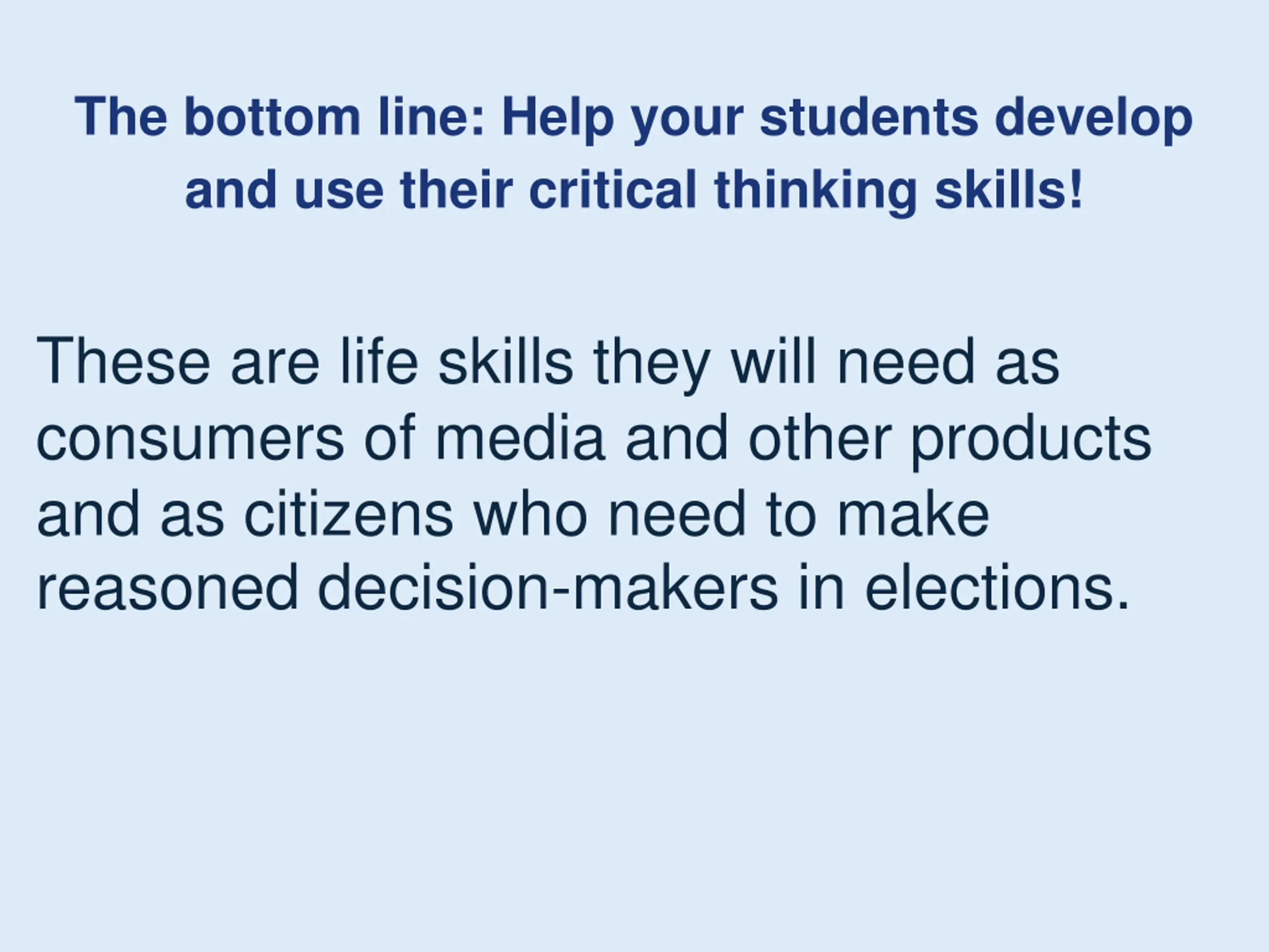 The bottom line: Help your students develop and use their critical thinking skills! These are life skills they will need as consumers of media and other products and as citizens who need to make reasoned decision-makers in elections.