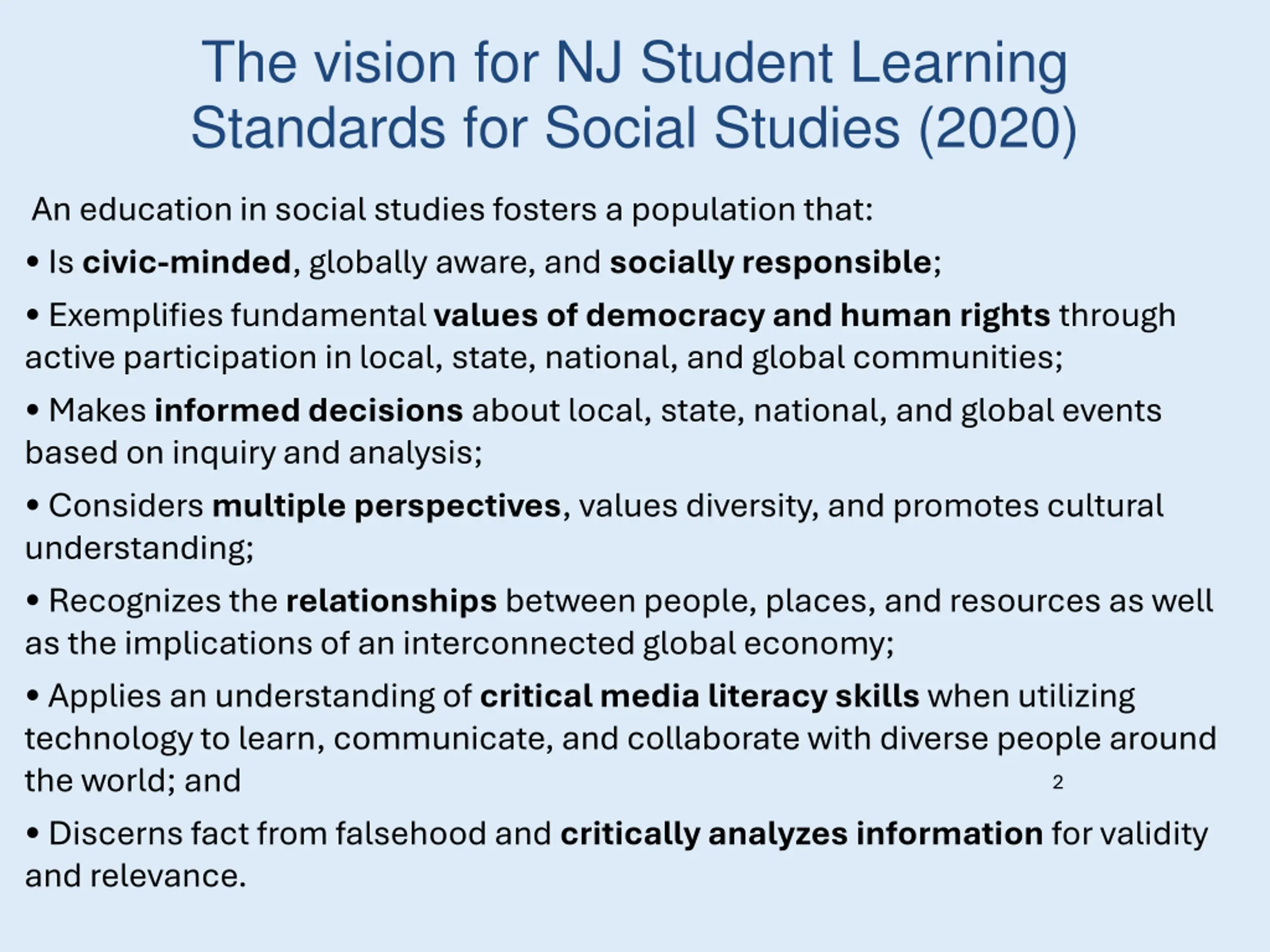 The vision for NJ Student Learning Standards for Social Studies (2020) An education in social studies fosters a population that: Is civic-minded, globally aware, and socially responsible; Exemplifies fundamental values of democracy and human rights through active participation in local, state, national, and global communities; Makes informed decisions about local, state, national, and global events based on inquiry and analysis; Considers multiple perspectives, values diversity, and promotes cultural understanding; Recognizes the relationships between people, places, and resources as well as the implications of an interconnected global economy; Applies an understanding of critical media literacy skills when utilizing technology to learn, communicate, and collaborate with diverse people around the world; and Discerns fact from falsehood and critically analyzes information for validity and relevance. 2