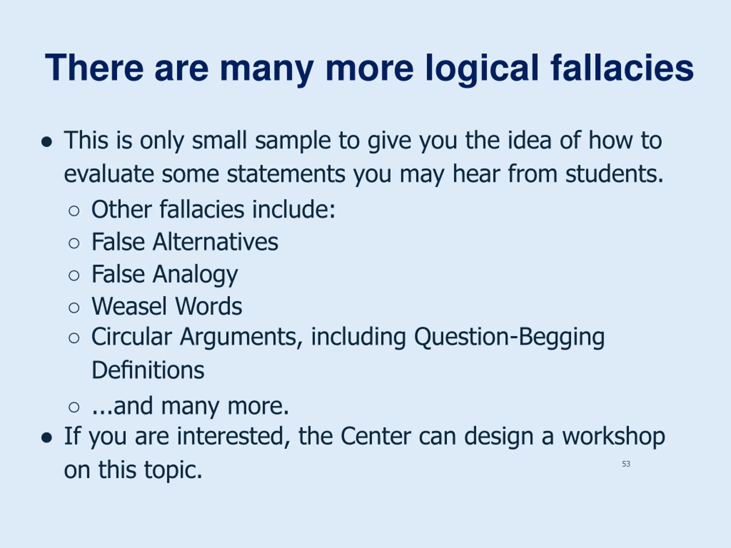 There are many more logical fallacies This is only small sample to give you the idea of how to evaluate some statements you may hear from students. Other fallacies include: False Alternatives False Analogy Weasel Words Circular Arguments, including Question-Begging Definitions ...and many more. If you are interested, the Center can design a workshop on this topic. 53