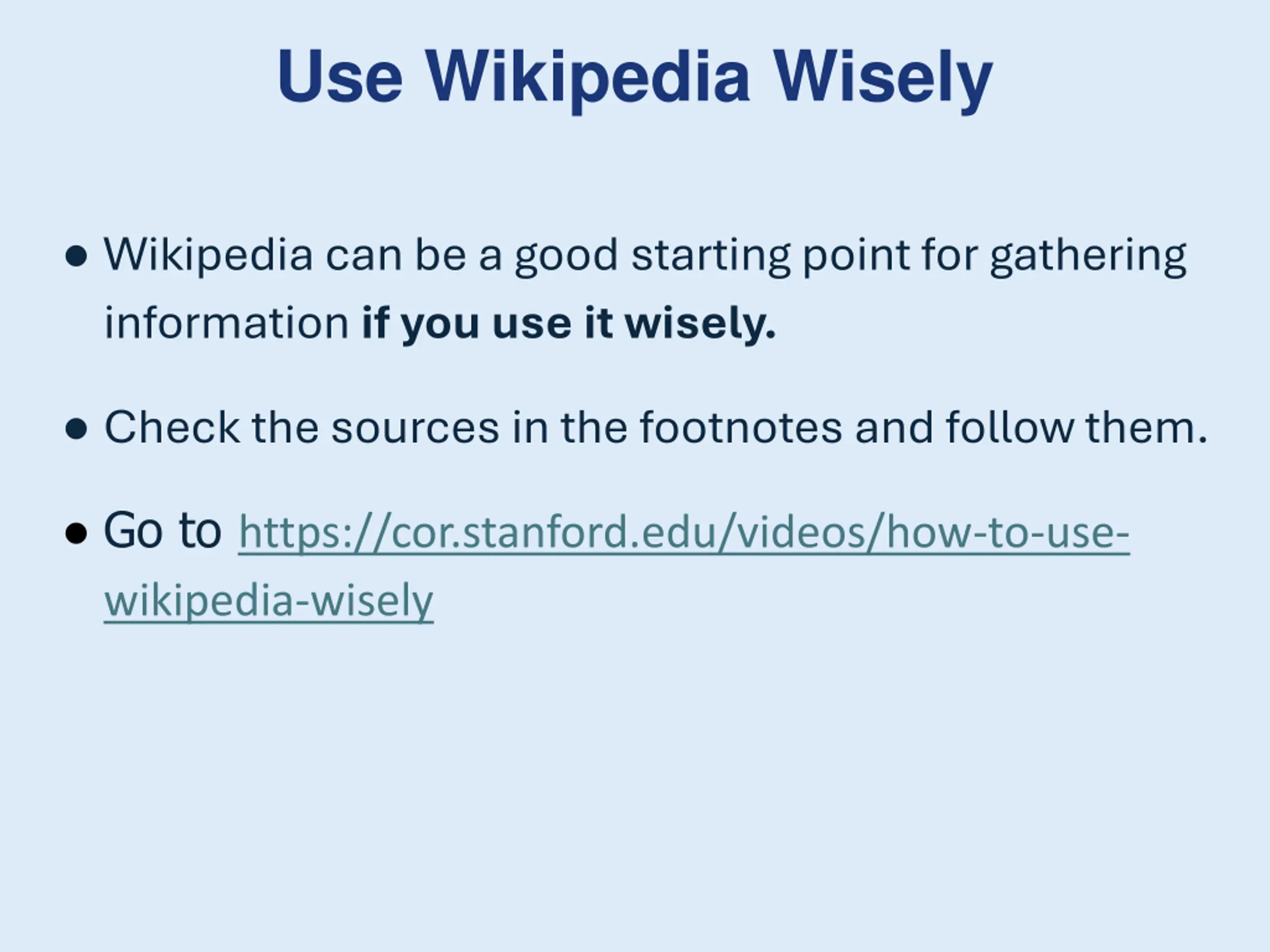 Use Wikipedia Wisely Wikipedia can be a good starting point for gathering information if you use it wisely. Check the sources in the footnotes and follow them. Go to https://cor.stanford.edu/videos/how-to-use- wikipedia-wisely
