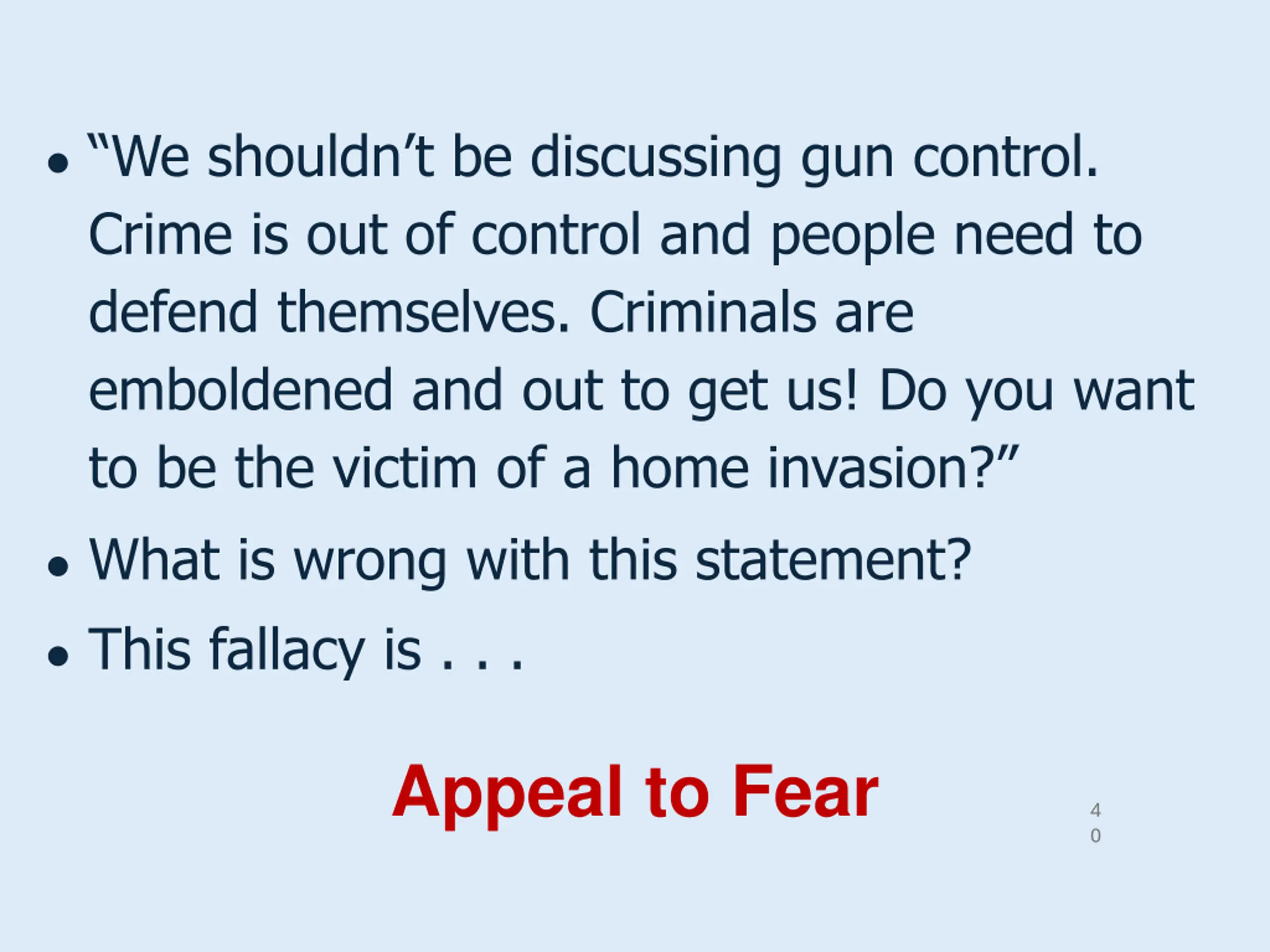 We shouldnt be discussing gun control. Crime is out of control and people need to defend themselves. Criminals are emboldened and out to get us! Do you want to be the victim of a home invasion? What is wrong with this statement? This fallacy is . . . Appeal to Fear 4 0