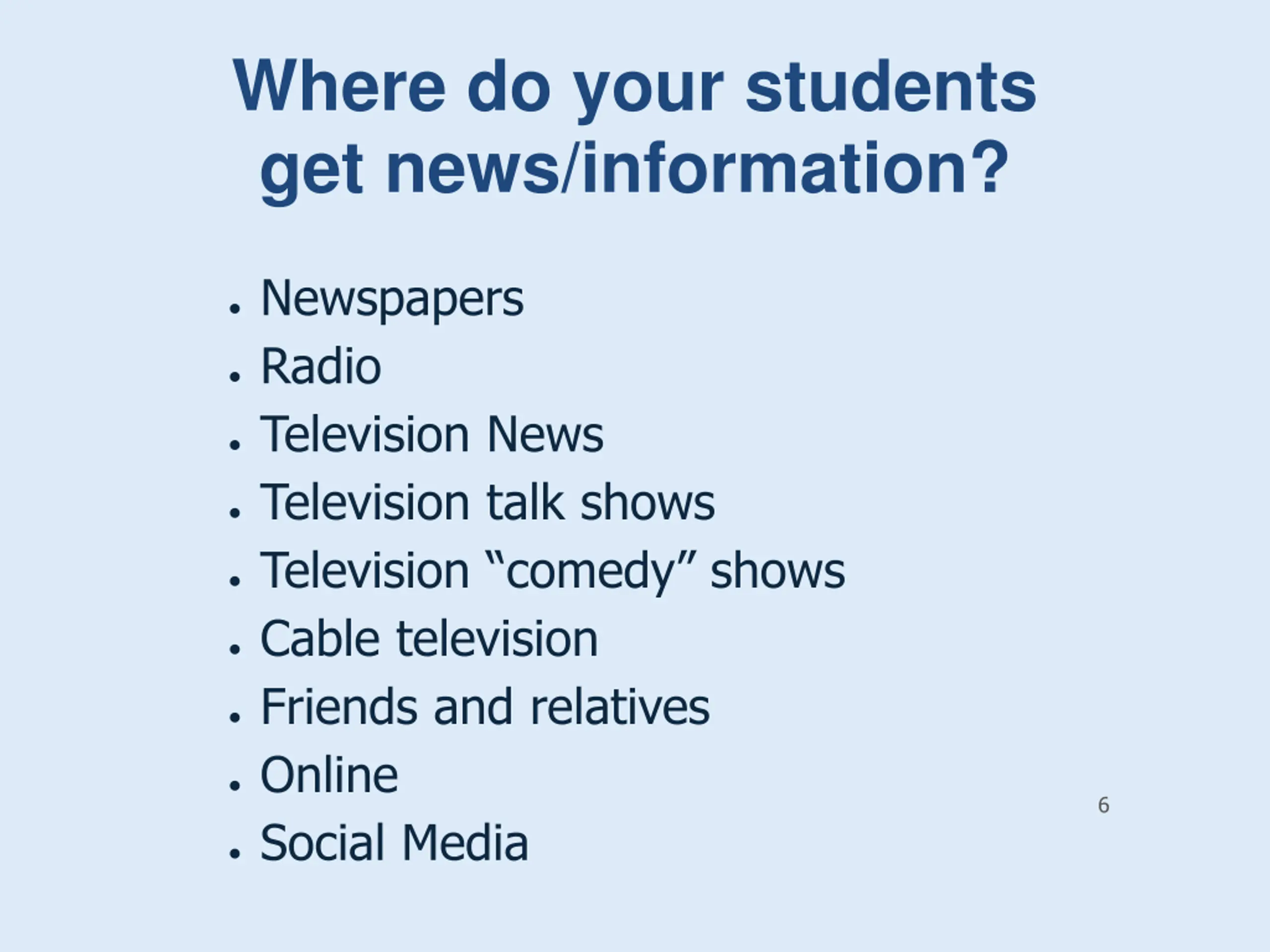 Where do your students get news/information? Newspapers Radio Television News Television talk shows Television comedy shows Cable television Friends and relatives Online Social Media 6