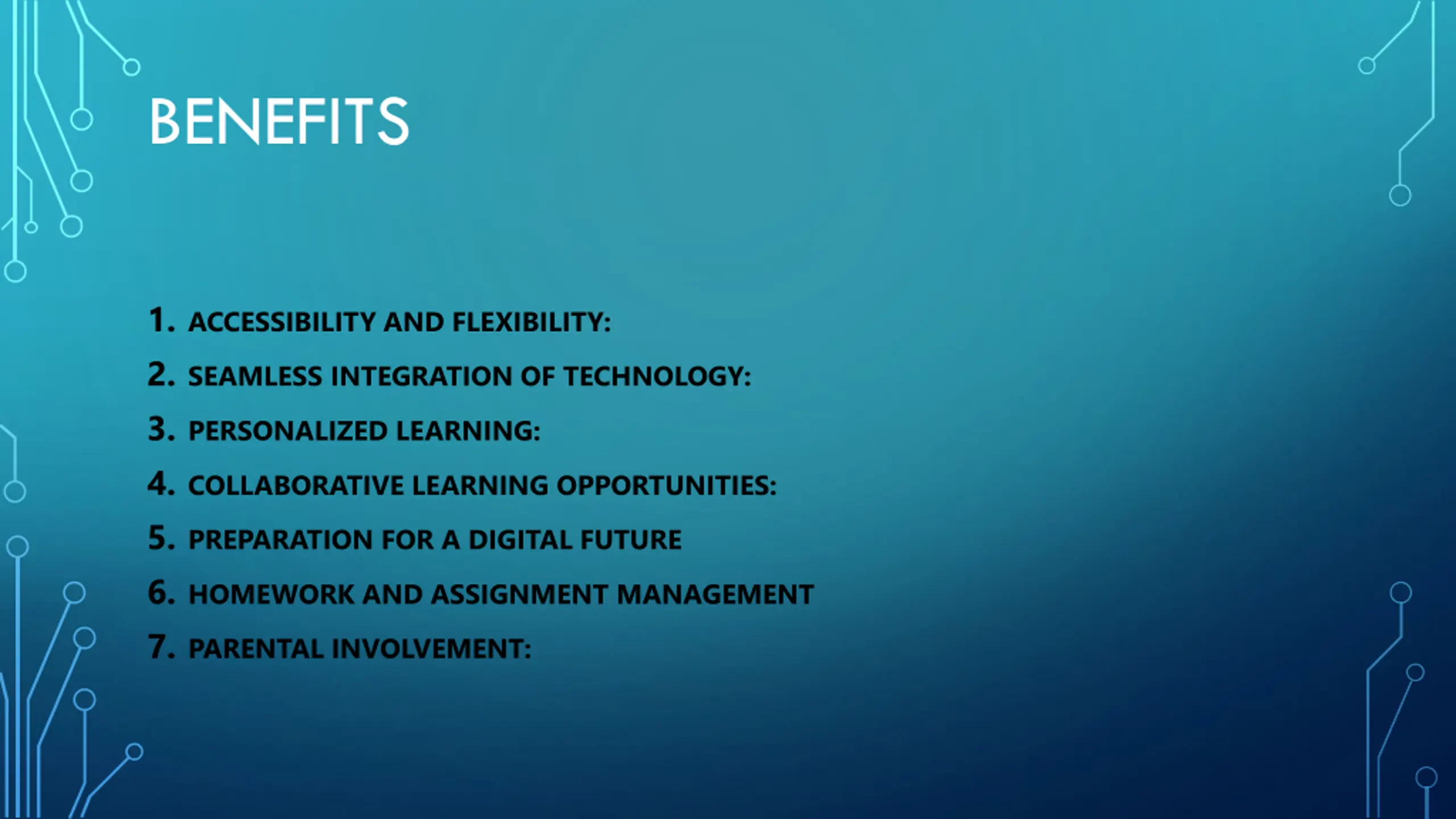 BENEFITS 1. ACCESSIBILITY AND FLEXIBILITY: 2. SEAMLESS INTEGRATION OF TECHNOLOGY: 3. PERSONALIZED LEARNING: 4. COLLABORATIVE LEARNING OPPORTUNITIES: 5. PREPARATION FOR A DIGITAL FUTURE 6. HOMEWORK AND ASSIGNMENT MANAGEMENT 7. PARENTAL INVOLVEMENT: