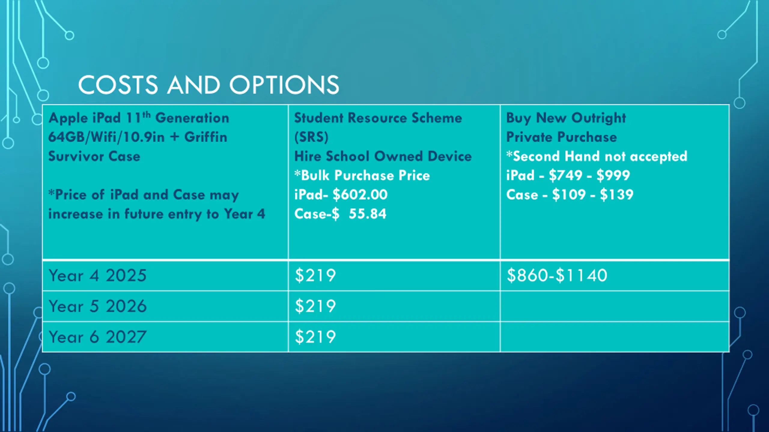 COSTS AND OPTIONS Apple iPad 11thGeneration 64GB/Wifi/10.9in + Griffin Survivor Case Student Resource Scheme (SRS) Hire School Owned Device *Bulk Purchase Price iPad- $602.00 Case-$ 55.84 Buy New Outright Private Purchase *Second Hand not accepted iPad - $749 - $999 Case - $109 - $139 *Price of iPad and Case may increase in future entry to Year 4 Year 4 2025 $219 $860-$1140 Year 5 2026 $219 Year 6 2027 $219