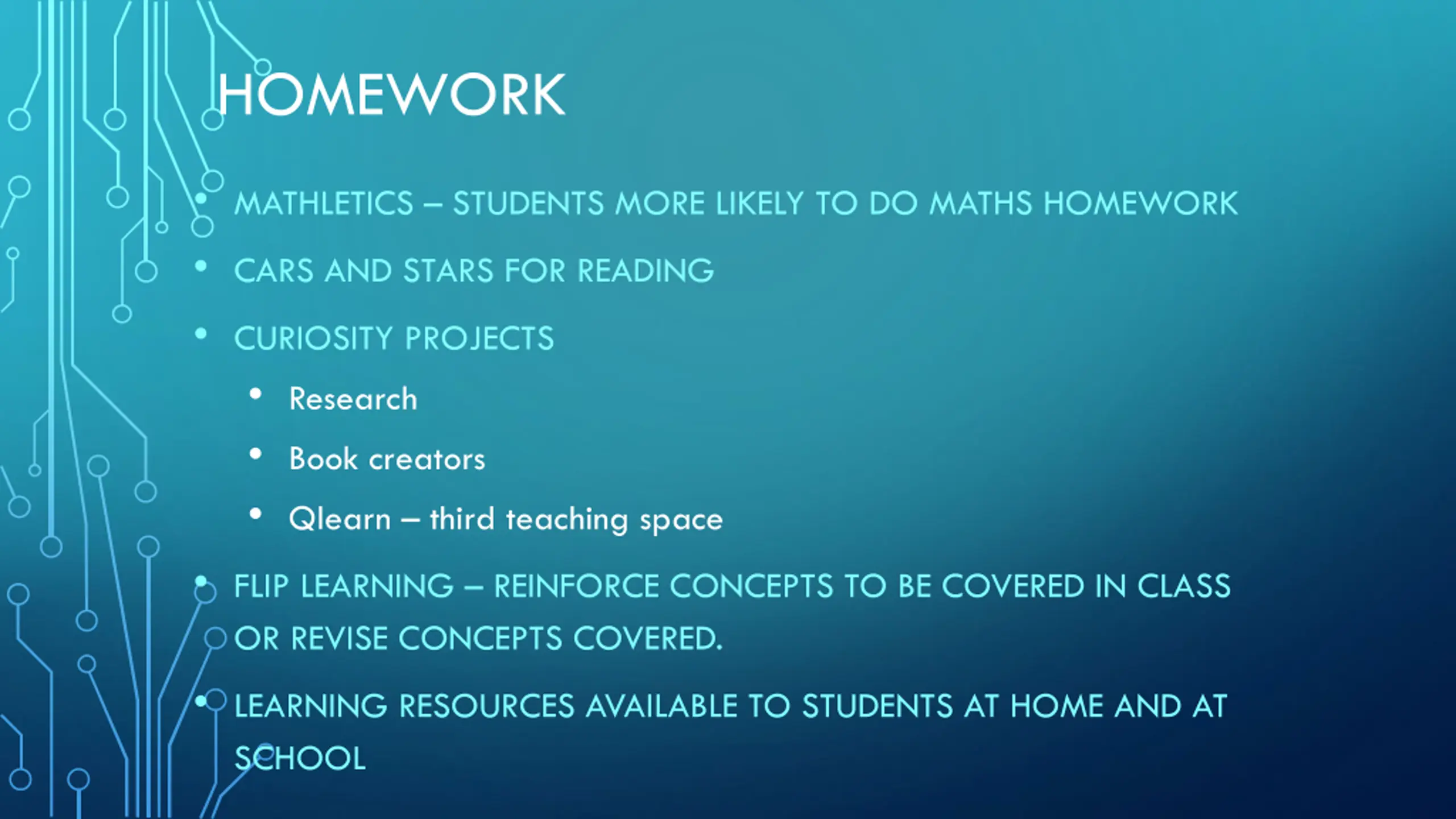 HOMEWORK MATHLETICS STUDENTS MORE LIKELY TO DO MATHS HOMEWORK CARS AND STARS FOR READING CURIOSITY PROJECTS Research Book creators Qlearn third teaching space FLIP LEARNING REINFORCE CONCEPTS TO BE COVERED IN CLASS OR REVISE CONCEPTS COVERED. LEARNING RESOURCES AVAILABLE TO STUDENTS AT HOME AND AT SCHOOL
