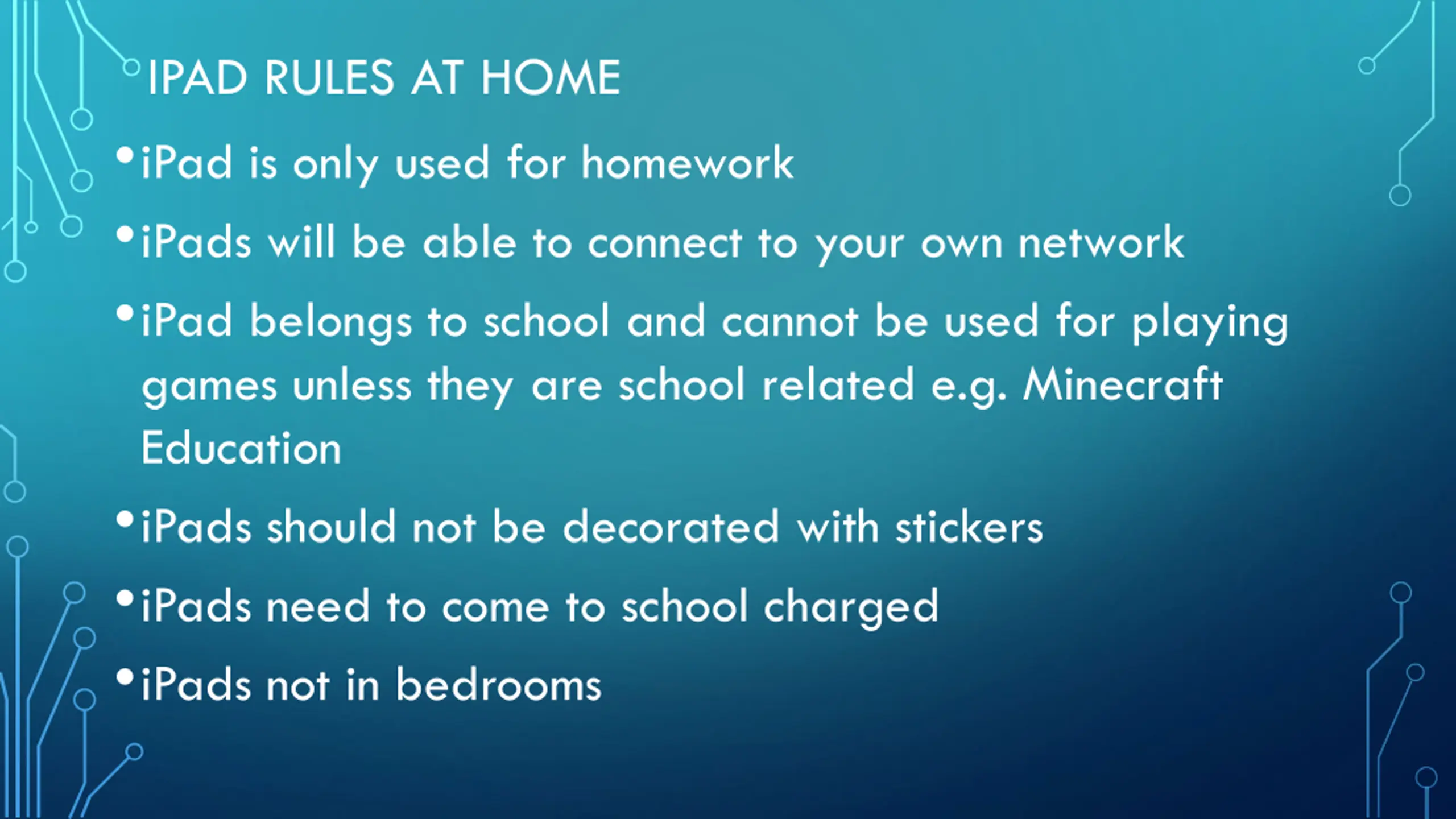 IPAD RULES AT HOME iPad is only used for homework iPads will be able to connect to your own network iPad belongs to school and cannot be used for playing games unless they are school related e.g. Minecraft Education iPads should not be decorated with stickers iPads need to come to school charged iPads not in bedrooms