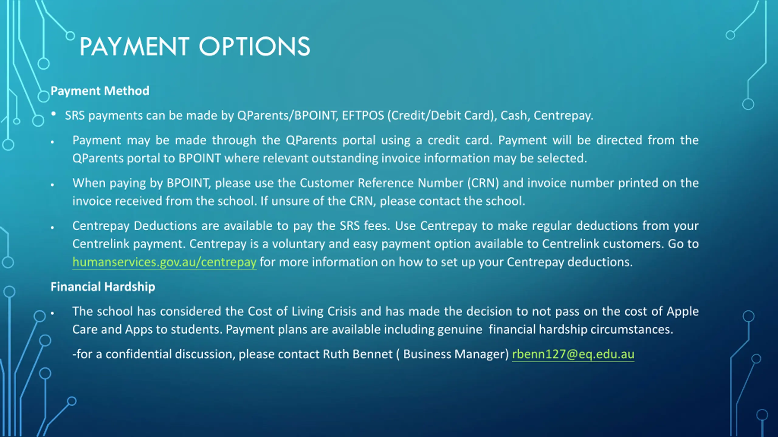PAYMENT OPTIONS Payment Method SRS payments can be made by QParents/BPOINT, EFTPOS (Credit/Debit Card), Cash, Centrepay. Payment may be made through the QParents portal using a credit card. Payment will be directed from the QParents portal to BPOINT where relevant outstanding invoice information may be selected. When paying by BPOINT, please use the Customer Reference Number (CRN) and invoice number printed on the invoice received from the school. If unsure of the CRN, please contact the school. Centrepay Deductions are available to pay the SRS fees. Use Centrepay to make regular deductions from your Centrelink payment. Centrepay is a voluntary and easy payment option available to Centrelink customers. Go to humanservices.gov.au/centrepay for more information on how to set up your Centrepay deductions. Financial Hardship The school has considered the Cost of Living Crisis and has made the decision to not pass on the cost of Apple Care and Apps to students.Payment plans are available including genuine financial hardship circumstances. -for a confidential discussion, please contact Ruth Bennet ( Business Manager) rbenn127@eq.edu.au