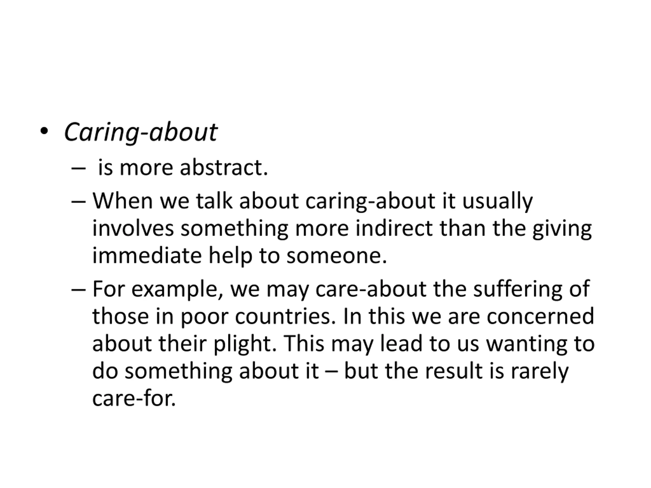 Caring-about is more abstract. When we talk about caring-about it usually involves something more indirect than the giving immediate help to someone. For example, we may care-about the suffering of those in poor countries. In this we are concerned about their plight. This may lead to us wanting to do something about it but the result is rarely care-for.
