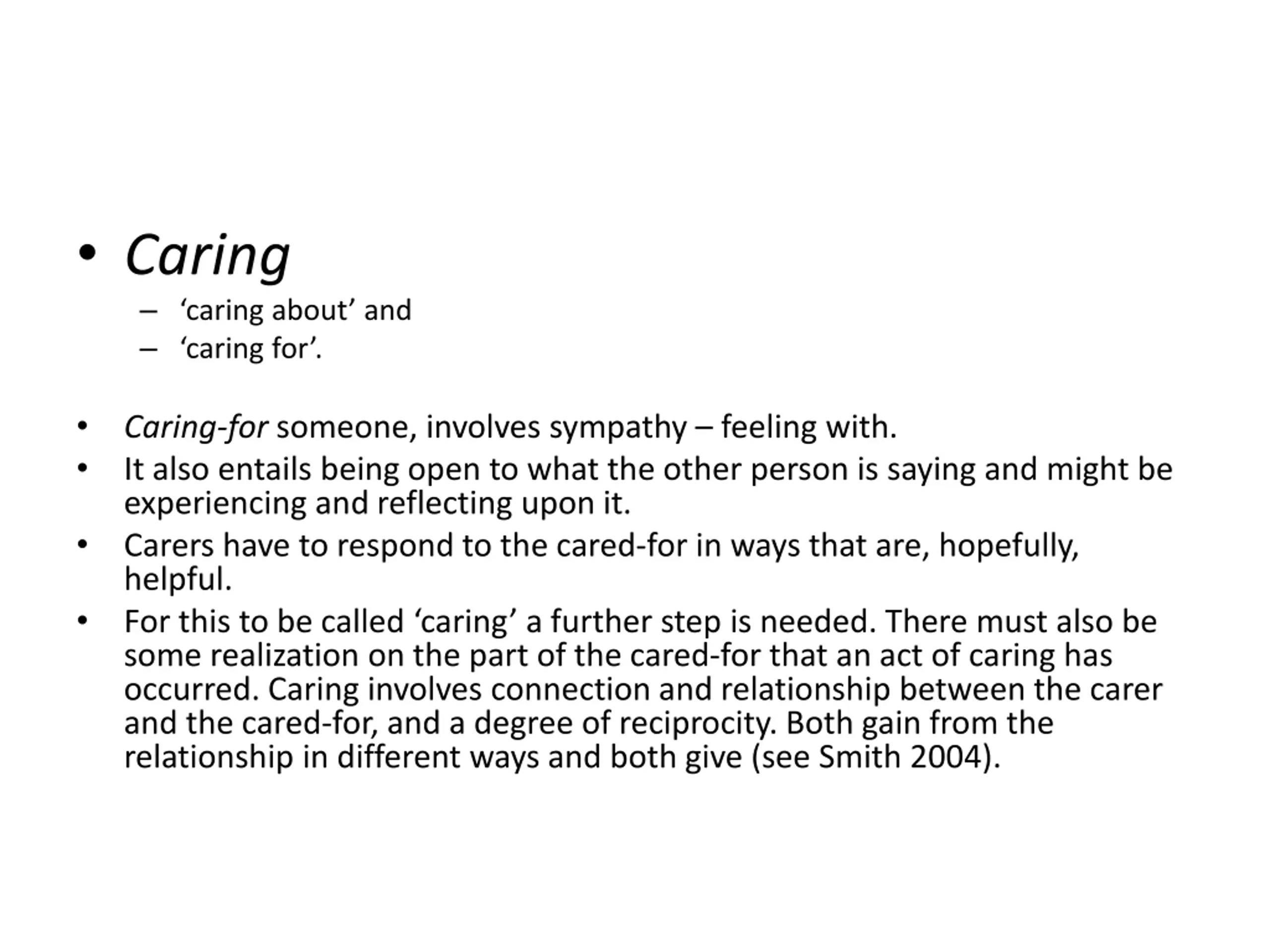 Caring caring about and caring for . Caring-for someone, involves sympathy feeling with. It also entails being open to what the other person is saying and might be experiencing and reflecting upon it. Carers have to respond to the cared-for in ways that are, hopefully, helpful. For this to be called caring a further step is needed. There must also be some realization on the part of the cared-for that an act of caring has occurred. Caring involves connection and relationship between the carer and the cared-for, and a degree of reciprocity. Both gain from the relationship in different ways and both give (see Smith 2004).