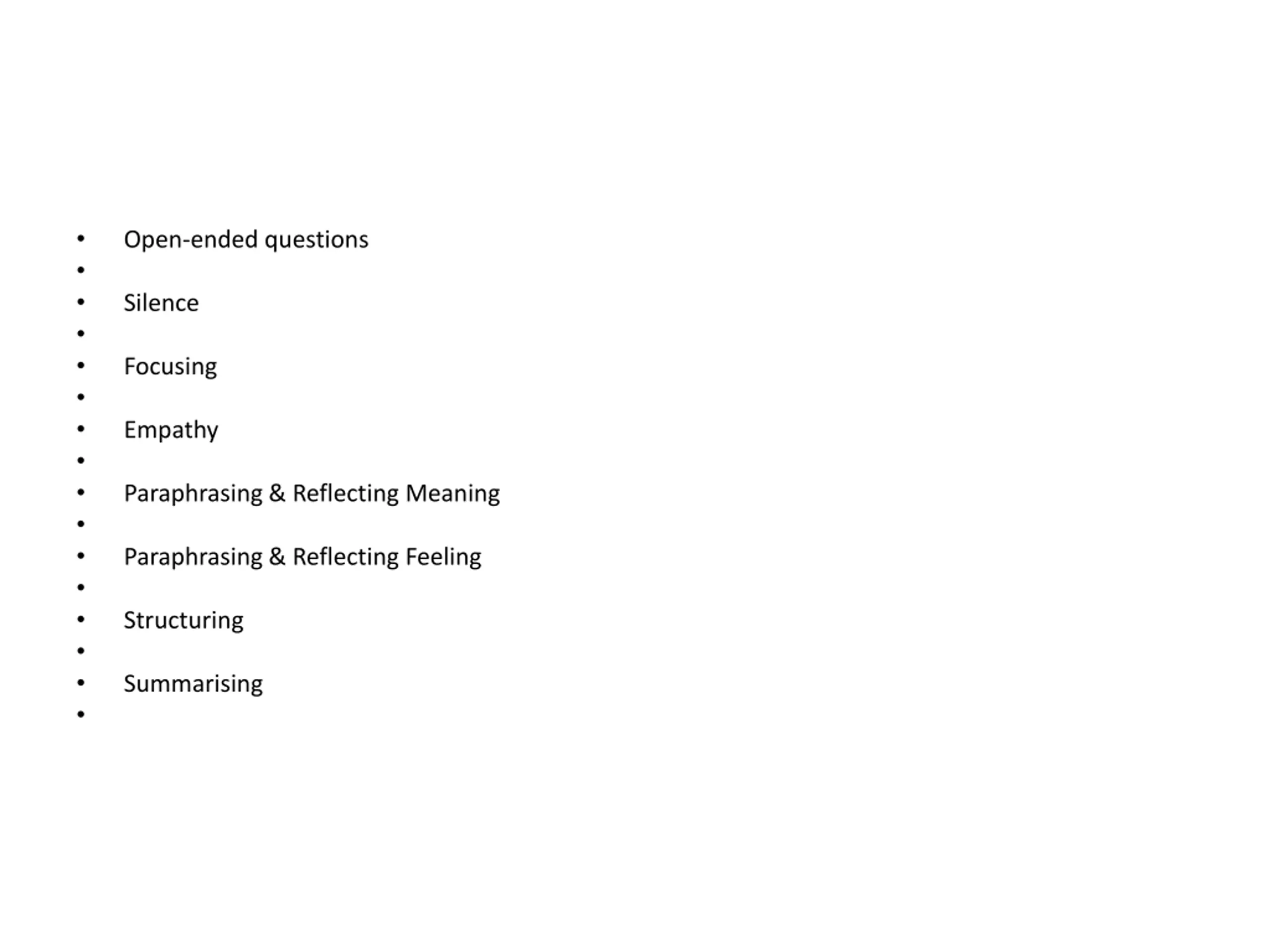 Open-ended questions Silence Focusing Empathy Paraphrasing & Reflecting Meaning Paraphrasing & Reflecting Feeling Structuring Summarising