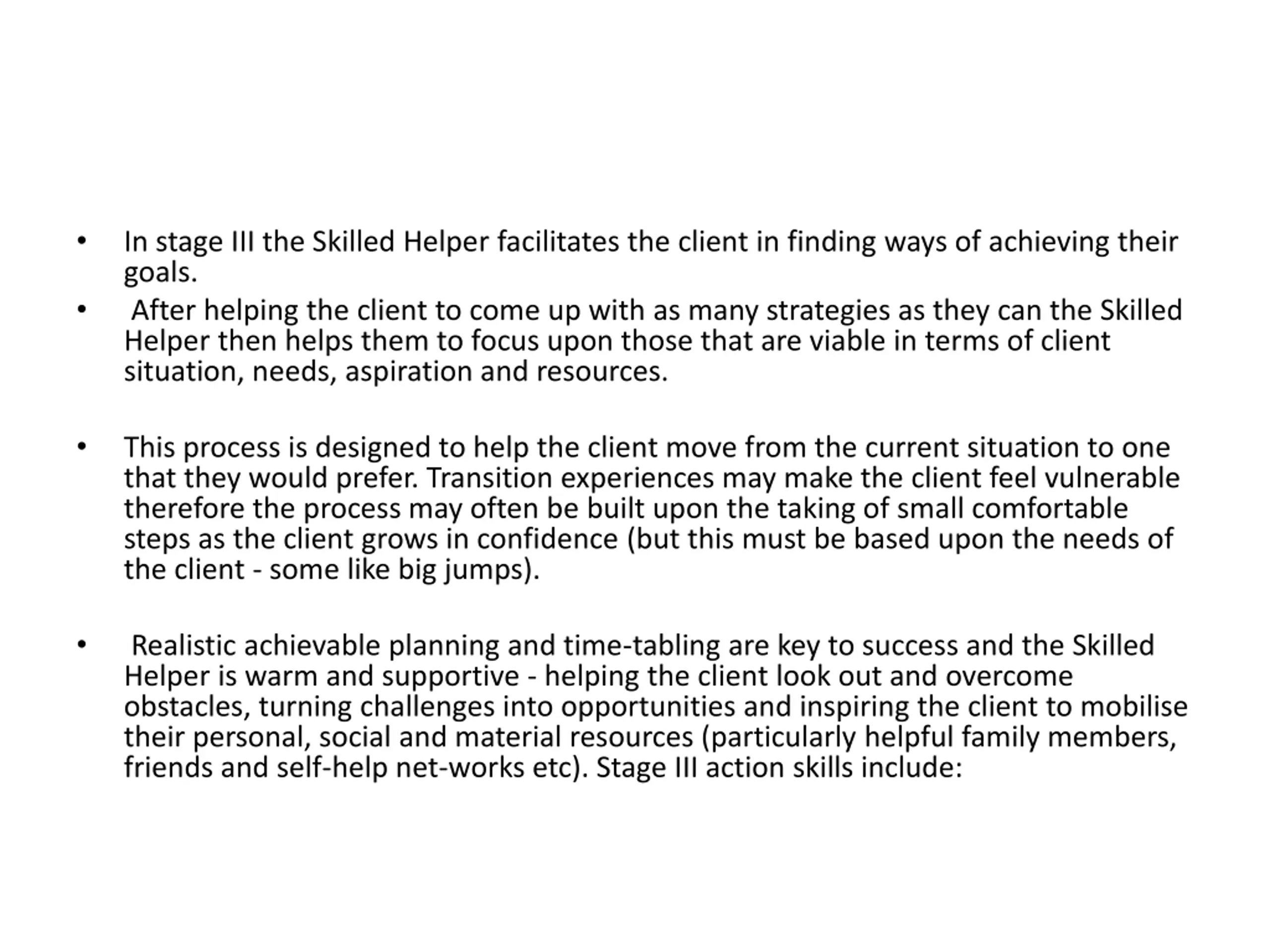 In stage III the Skilled Helper facilitates the client in finding ways of achieving their goals. After helping the client to come up with as many strategies as they can the Skilled Helper then helps them to focus upon those that are viable in terms of client situation, needs, aspiration and resources. This process is designed to help the client move from the current situation to one that they would prefer. Transition experiences may make the client feel vulnerable therefore the process may often be built upon the taking of small comfortable steps as the client grows in confidence (but this must be based upon the needs of the client - some like big jumps). Realistic achievable planning and time-tabling are key to success and the Skilled Helper is warm and supportive - helping the client look out and overcome obstacles, turning challenges into opportunities and inspiring the client to mobilise their personal, social and material resources (particularly helpful family members, friends and self-help net-works etc). Stage III action skills include: