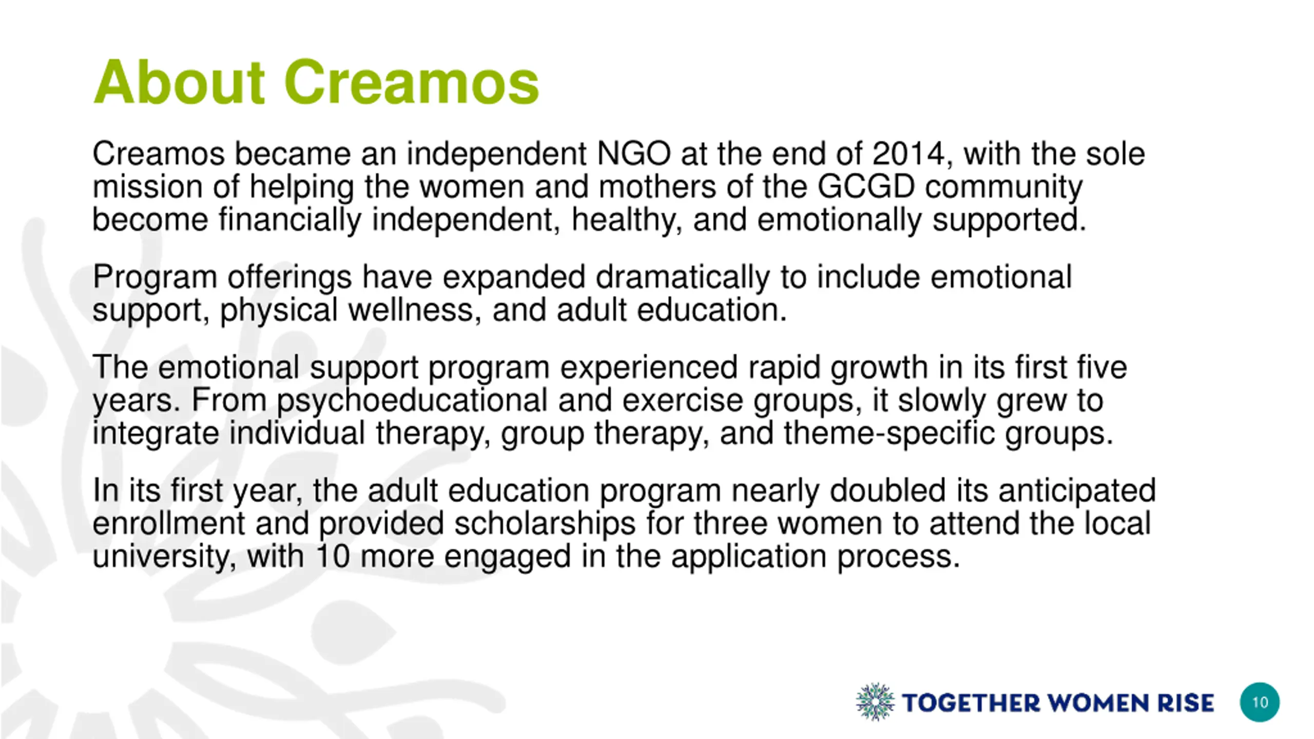 About Creamos Creamos became an independent NGO at the end of 2014, with the sole mission of helping the women and mothers of the GCGD community become financially independent, healthy, and emotionally supported. Program offerings have expanded dramatically to include emotional support, physical wellness, and adult education. The emotional support program experienced rapid growth in its first five years. From psychoeducational and exercise groups, it slowly grew to integrate individual therapy, group therapy, and theme-specific groups. In its first year, the adult education program nearly doubled its anticipated enrollment and provided scholarships for three women to attend the local university, with 10 more engaged in the application process. 10