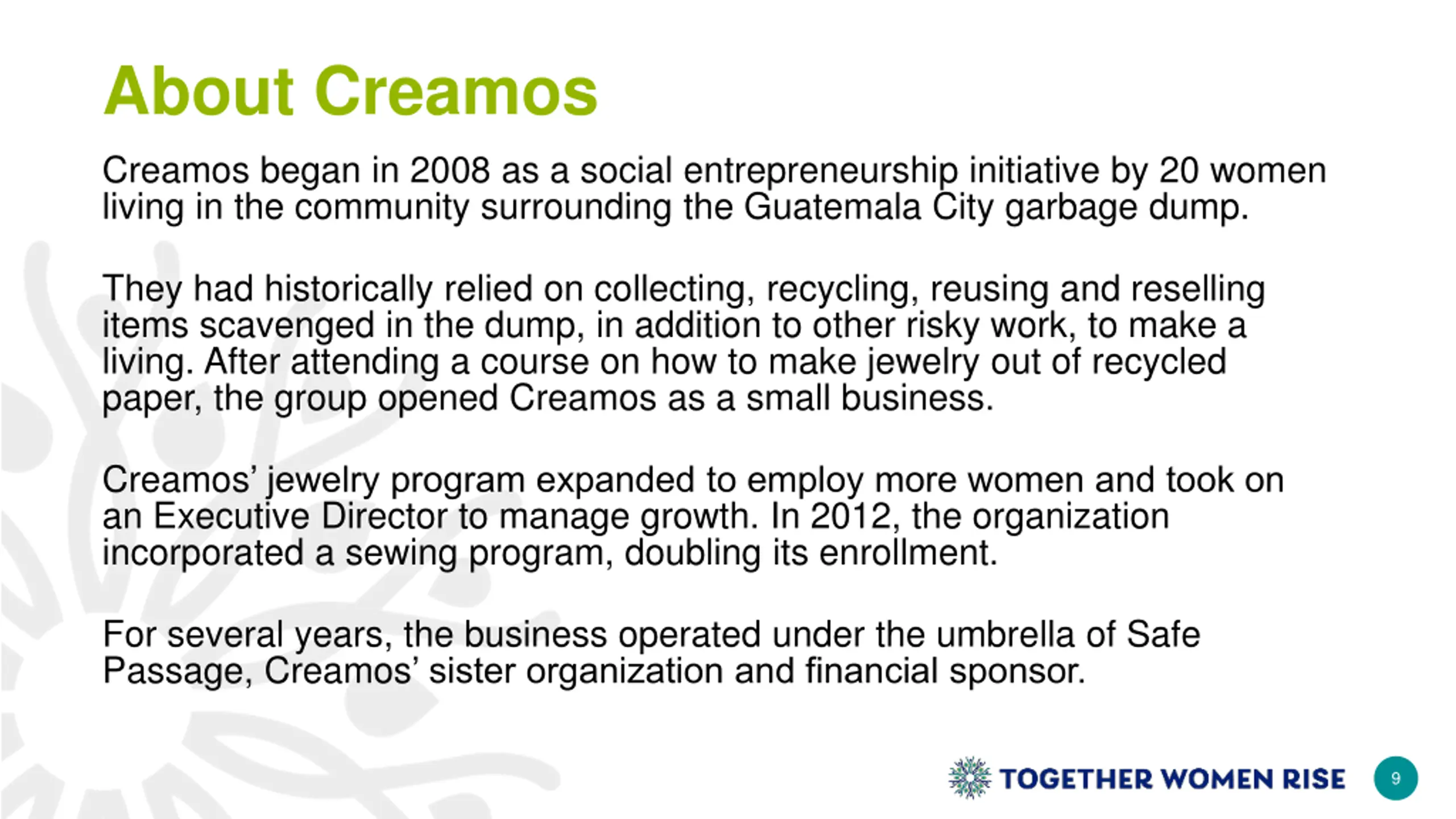 About Creamos Creamos began in 2008 as a social entrepreneurship initiative by 20 women living in the community surrounding the Guatemala City garbage dump. They had historically relied on collecting, recycling, reusing and reselling items scavenged in the dump, in addition to other risky work, to make a living. After attending a course on how to make jewelry out of recycled paper, the group opened Creamos as a small business. Creamos jewelry program expanded to employ more women and took on an Executive Director to manage growth. In 2012, the organization incorporated a sewing program, doubling its enrollment. For several years, the business operated under the umbrella of Safe Passage, Creamos sister organization and financial sponsor. 9