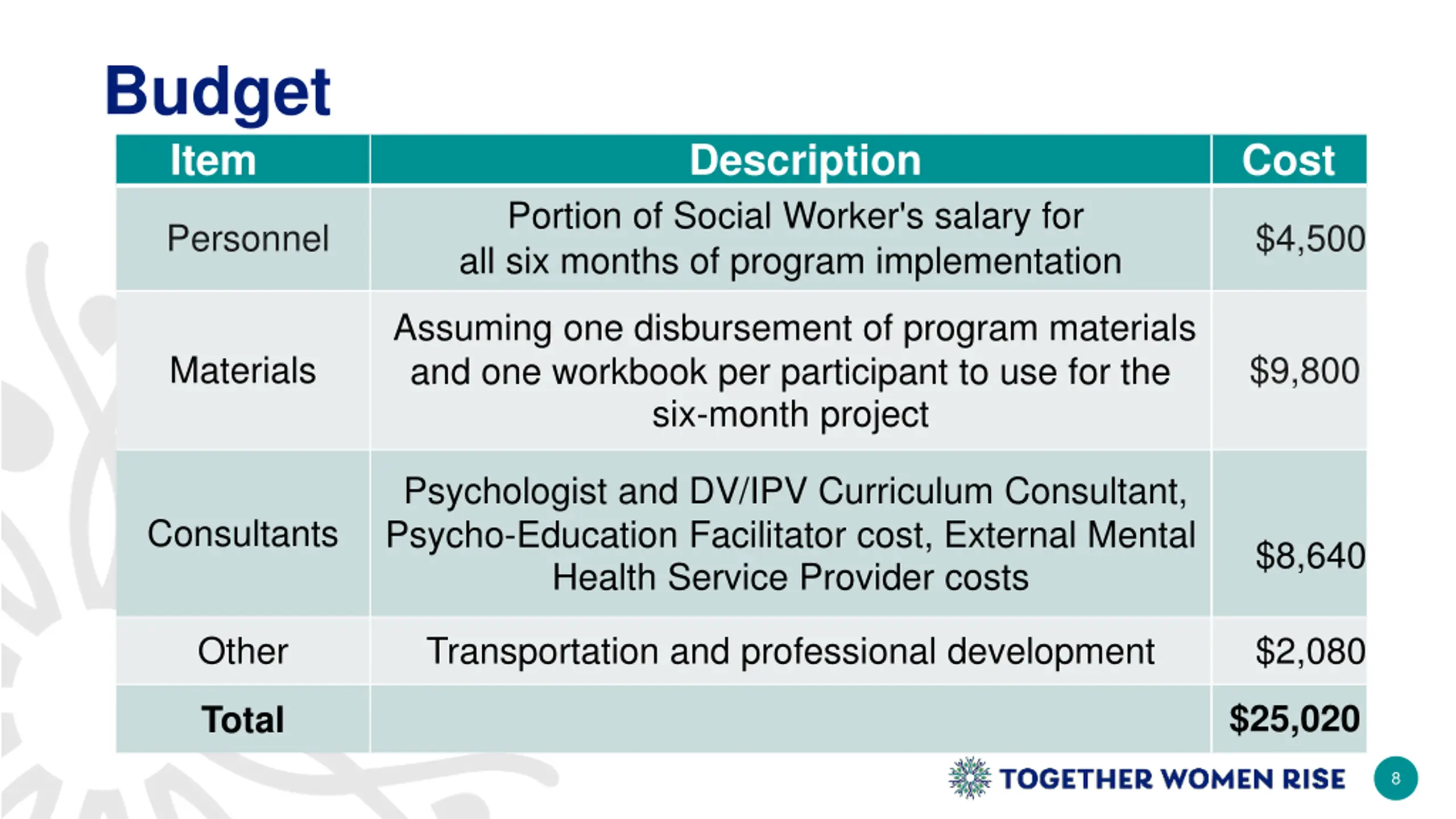 Budget Item Description Cost Portion of Social Worker's salary for all six months of program implementation Personnel $4,500 Assuming one disbursement of program materials and one workbook per participant to use for the six-month project Materials $9,800 Psychologist and DV/IPV Curriculum Consultant, Psycho-Education Facilitator cost, External Mental Health Service Provider costs Consultants $8,640 Other Transportation and professional development $2,080 $25,020 Total 8