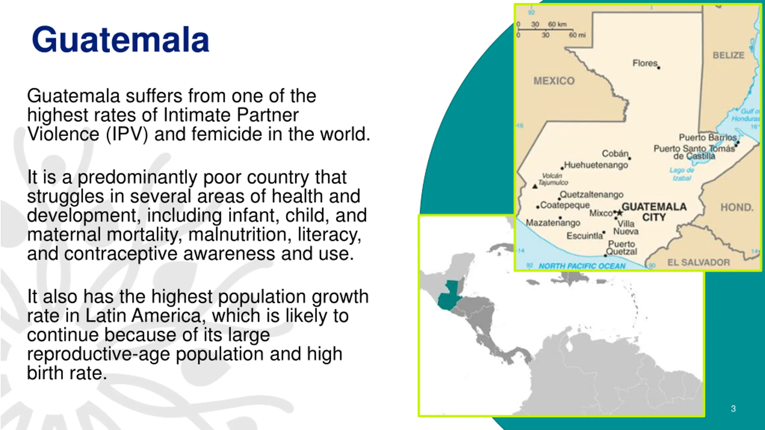 Guatemala Guatemala suffers from one of the highest rates of Intimate Partner Violence (IPV) and femicide in the world. It is a predominantly poor country that struggles in several areas of health and development, including infant, child, and maternal mortality, malnutrition, literacy, and contraceptive awareness and use. It also has the highest population growth rate in Latin America, which is likely to continue because of its large reproductive-age population and high birth rate. 3