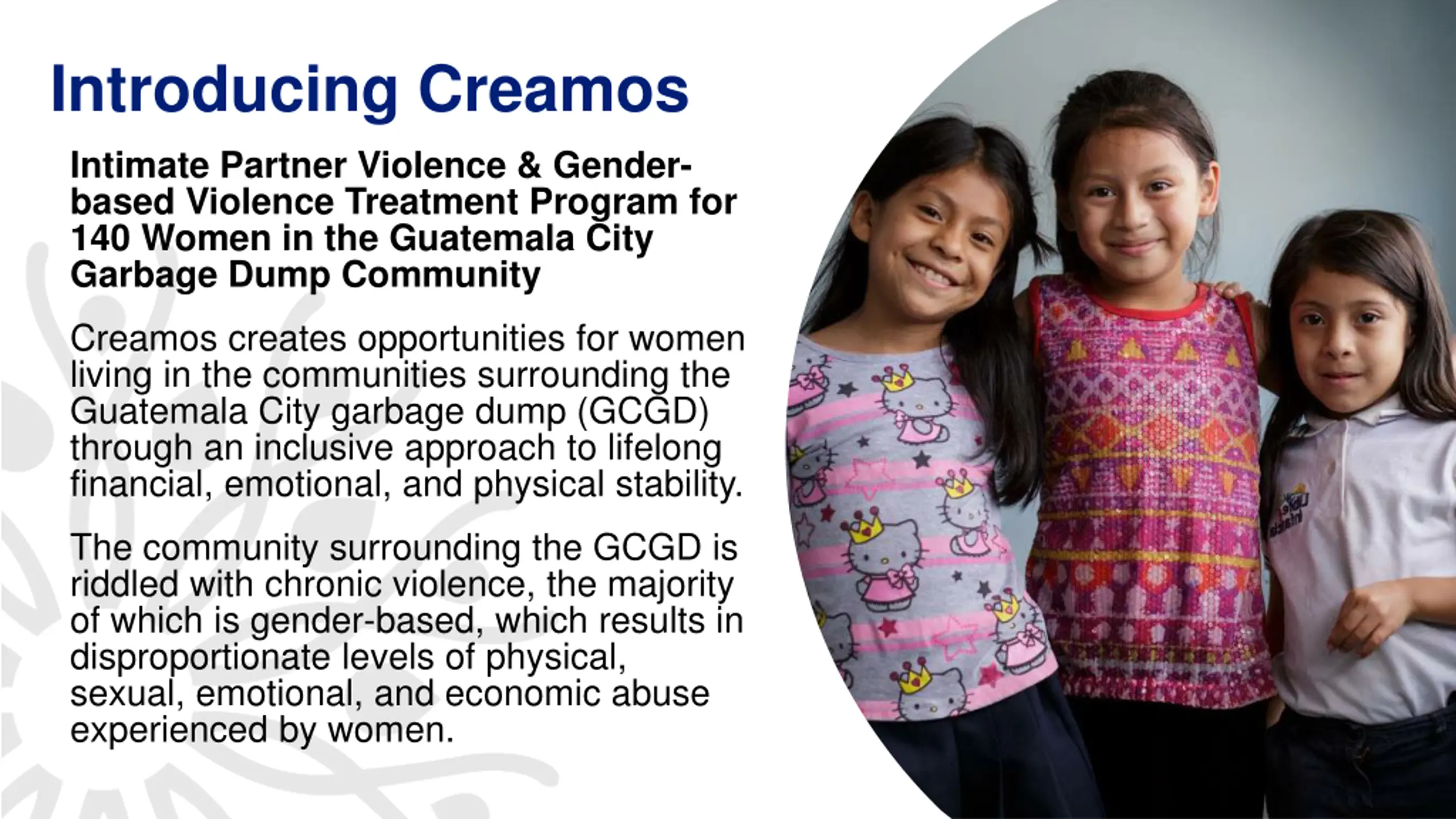 Introducing Creamos Intimate Partner Violence & Gender- based Violence Treatment Program for 140 Women in the Guatemala City Garbage Dump Community Creamos creates opportunities for women living in the communities surrounding the Guatemala City garbage dump (GCGD) through an inclusive approach to lifelong financial, emotional, and physical stability. The community surrounding the GCGD is riddled with chronic violence, the majority of which is gender-based, which results in disproportionate levels of physical, sexual, emotional, and economic abuse experienced by women. 2