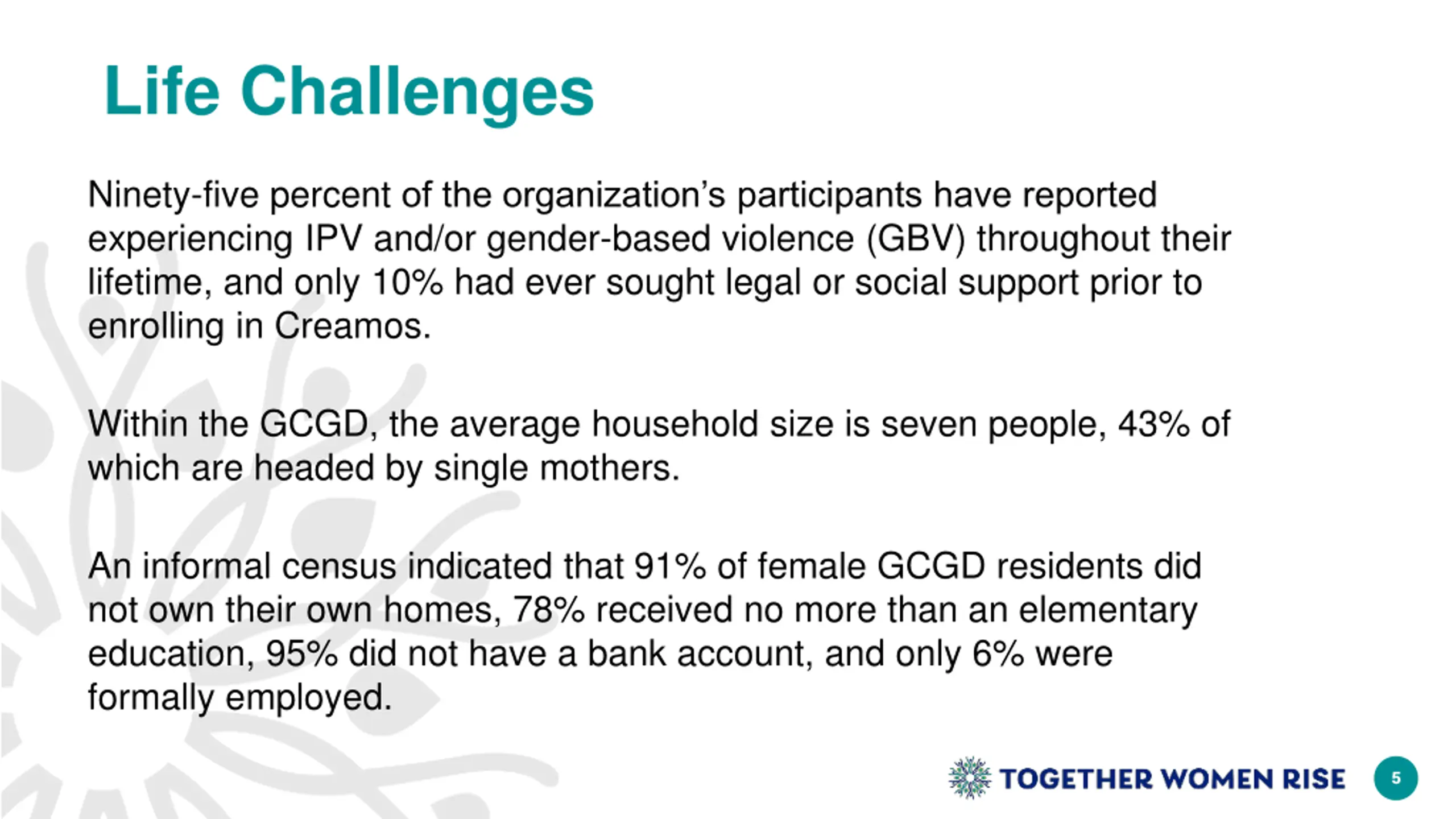 Life Challenges Ninety-five percent of the organization s participants have reported experiencing IPV and/or gender-based violence (GBV) throughout their lifetime, and only 10% had ever sought legal or social support prior to enrolling in Creamos. Within the GCGD, the average household size is seven people, 43% of which are headed by single mothers. An informal census indicated that 91% of female GCGD residents did not own their own homes, 78% received no more than an elementary education, 95% did not have a bank account, and only 6% were formally employed. 5
