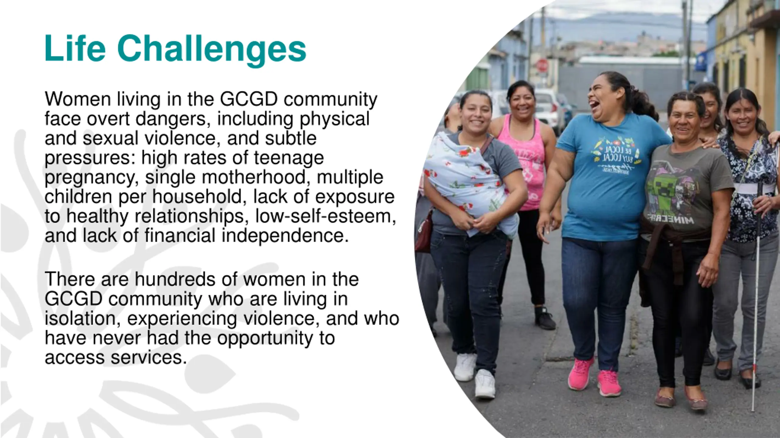 Life Challenges Women living in the GCGD community face overt dangers, including physical and sexual violence, and subtle pressures: high rates of teenage pregnancy, single motherhood, multiple children per household, lack of exposure to healthy relationships, low-self-esteem, and lack of financial independence. There are hundreds of women in the GCGD community who are living in isolation, experiencing violence, and who have never had the opportunity to access services. 4