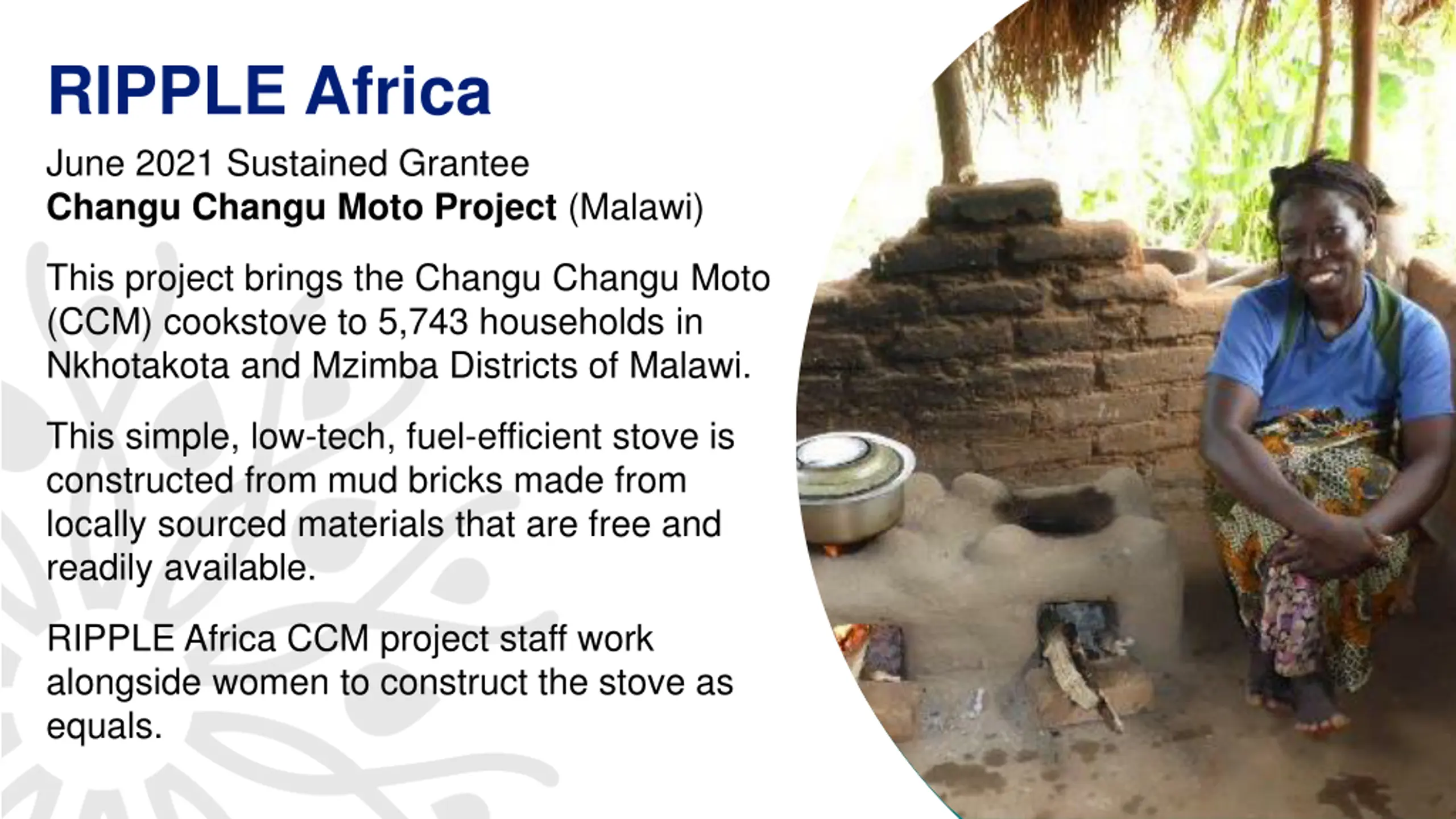 RIPPLE Africa June 2021 Sustained Grantee Changu Changu Moto Project (Malawi) This project brings the Changu Changu Moto (CCM) cookstove to 5,743 households in Nkhotakota and Mzimba Districts of Malawi. This simple, low-tech, fuel-efficient stove is constructed from mud bricks made from locally sourced materials that are free and readily available. RIPPLE Africa CCM project staff work alongside women to construct the stove as equals. 13