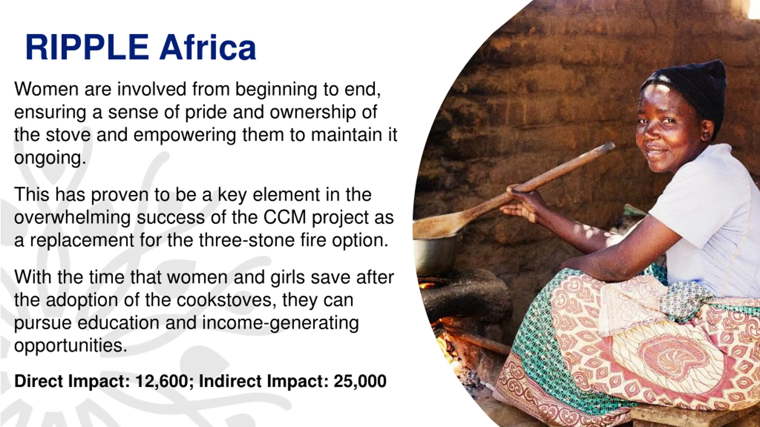 RIPPLE Africa Women are involved from beginning to end, ensuring a sense of pride and ownership of the stove and empowering them to maintain it ongoing. This has proven to be a key element in the overwhelming success of the CCM project as a replacement for the three-stone fire option. With the time that women and girls save after the adoption of the cookstoves, they can pursue education and income-generating opportunities. Direct Impact: 12,600; Indirect Impact: 25,000 14