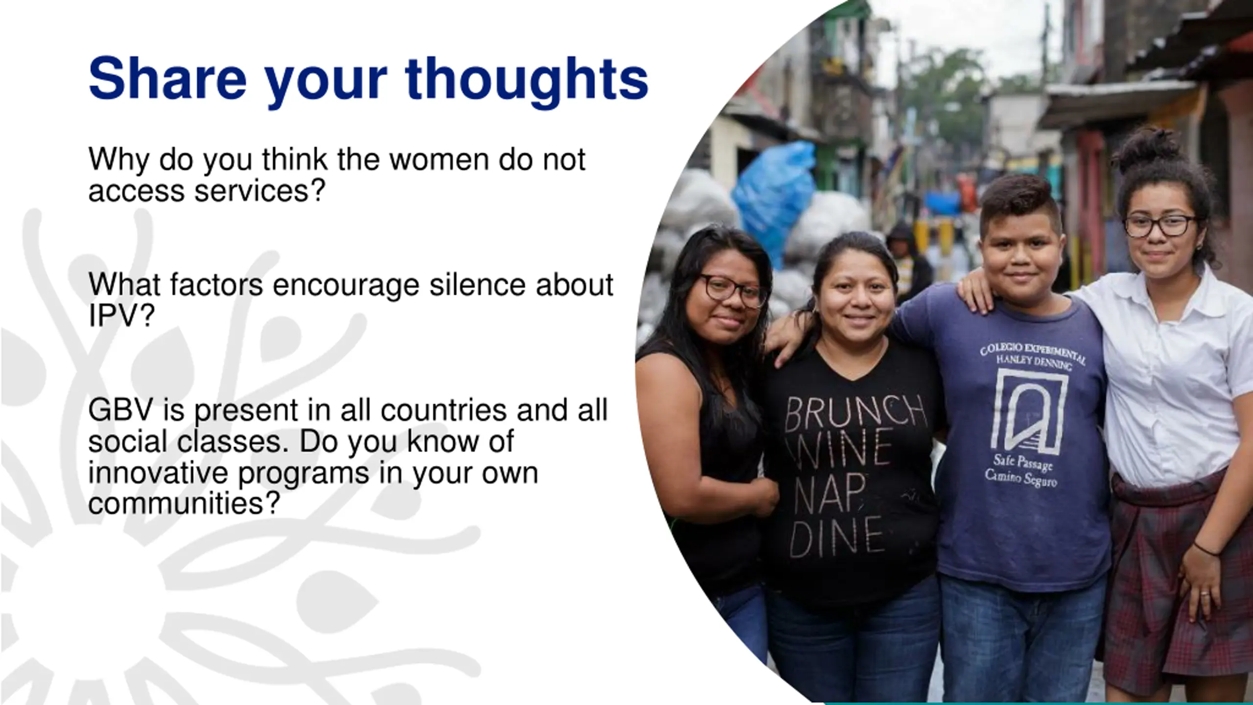 Share your thoughts Why do you think the women do not access services? What factors encourage silence about IPV? GBV is present in all countries and all social classes. Do you know of innovative programs in your own communities? 11