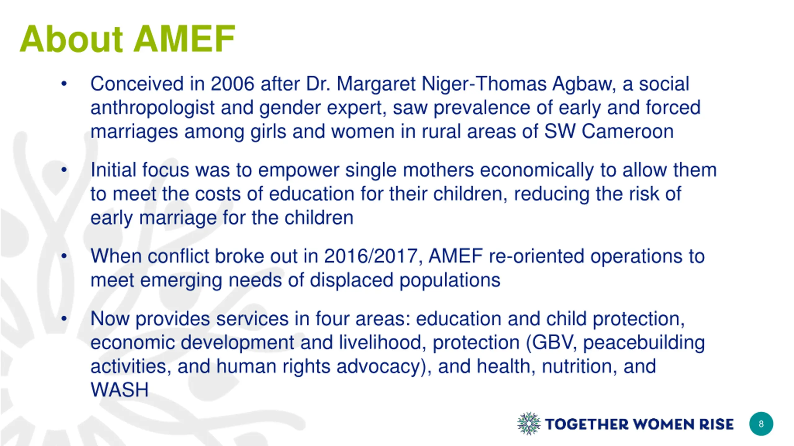 About AMEF Conceived in 2006 after Dr. Margaret Niger-Thomas Agbaw, a social anthropologist and gender expert, saw prevalence of early and forced marriages among girls and women in rural areas of SW Cameroon Initial focus was to empower single mothers economically to allow them to meet the costs of education for their children, reducing the risk of early marriage for the children When conflict broke out in 2016/2017, AMEF re-oriented operations to meet emerging needs of displaced populations Now provides services in four areas: education and child protection, economic development and livelihood, protection (GBV, peacebuilding activities, and human rights advocacy), and health, nutrition, and WASH 8