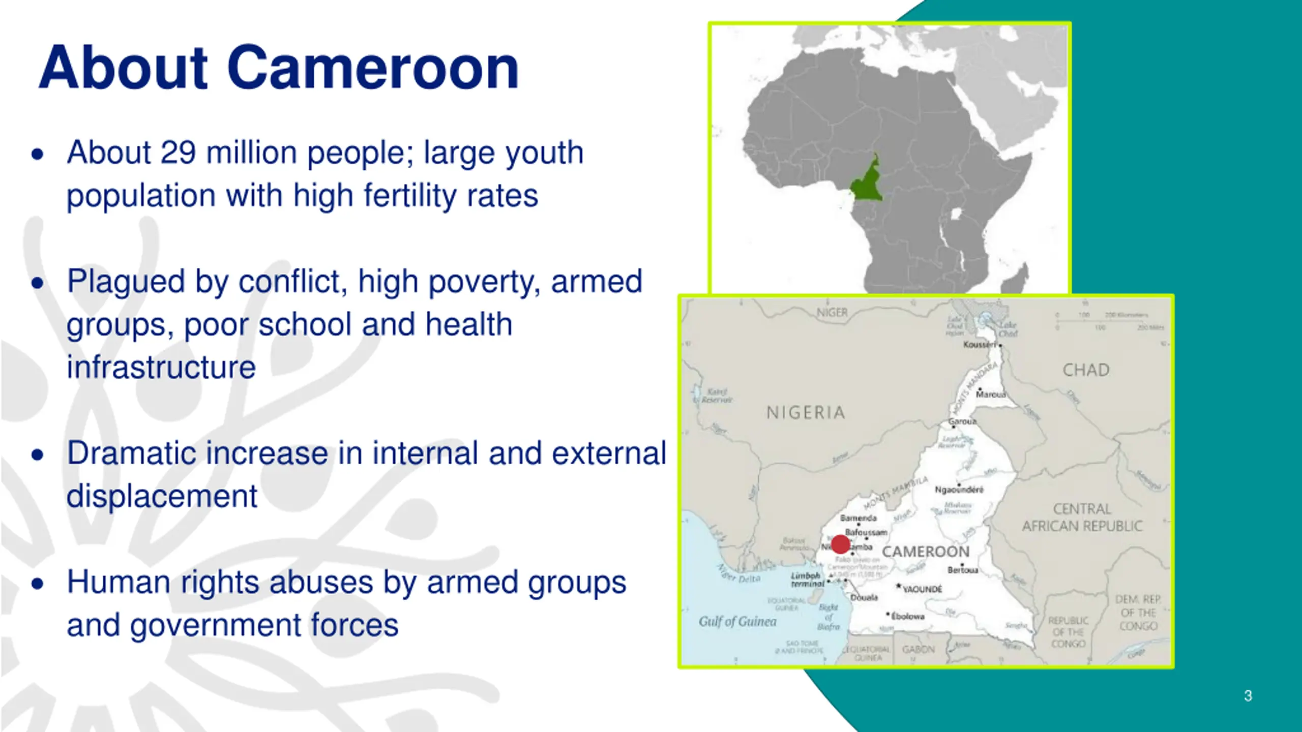About Cameroon About 29 million people; large youth population with high fertility rates Plagued by conflict, high poverty, armed groups, poor school and health infrastructure Dramatic increase in internal and external displacement Human rights abuses by armed groups and government forces 3