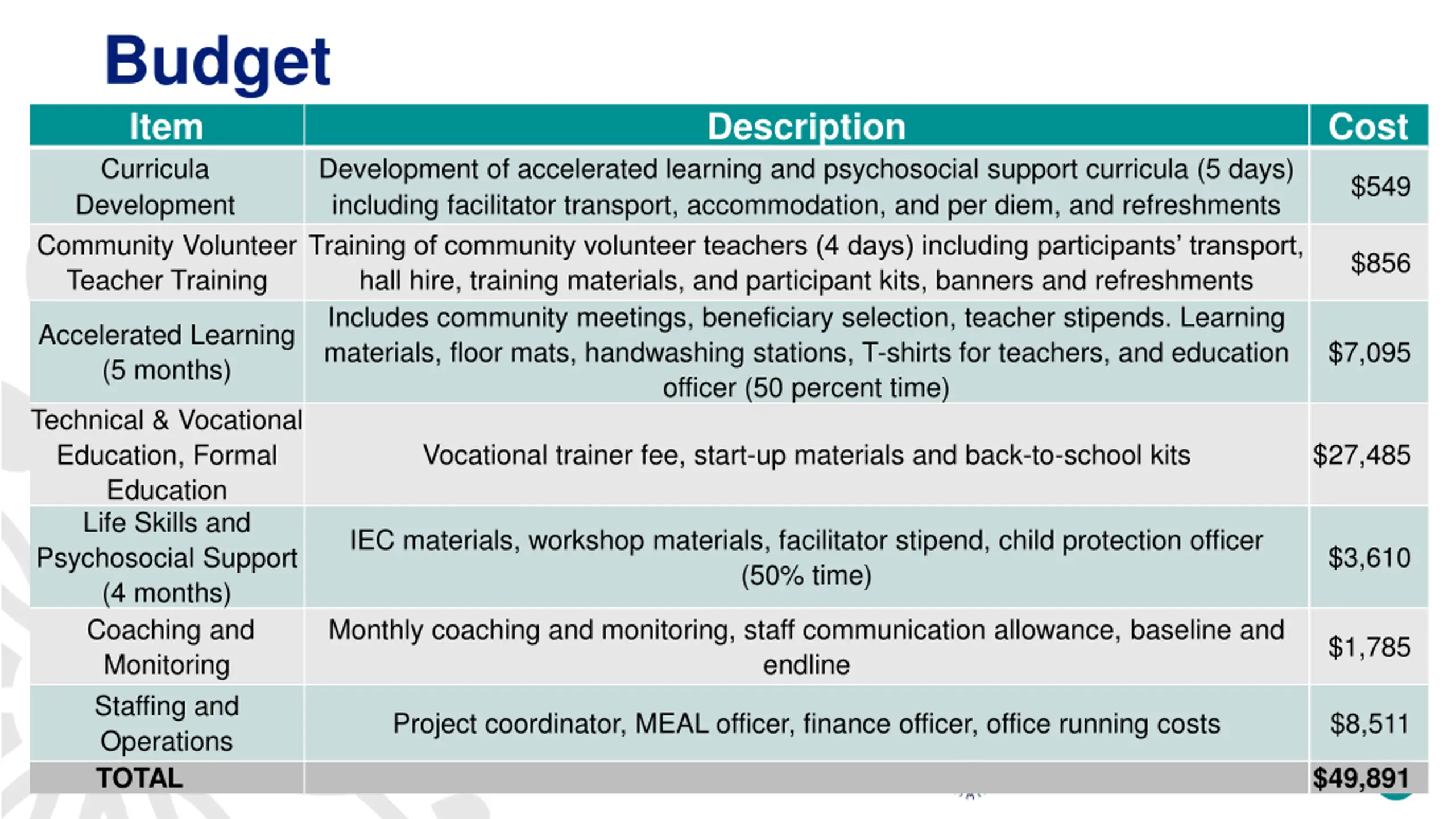 Budget Item Curricula Development Community Volunteer Teacher Training Description Cost Development of accelerated learning and psychosocial support curricula (5 days) including facilitator transport, accommodation, and per diem, and refreshments Training of community volunteer teachers (4 days) including participants transport, hall hire, training materials, and participant kits, banners and refreshments Includes community meetings, beneficiary selection, teacher stipends. Learning materials, floor mats, handwashing stations, T-shirts for teachers, and education officer (50 percent time) Technical & Vocational Education, Formal Education Life Skills and Psychosocial Support (4 months) Coaching and Monitoring Staffing and Operations TOTAL $549 $856 Accelerated Learning (5 months) $7,095 Vocational trainer fee, start-up materials and back-to-school kits $27,485 IEC materials, workshop materials, facilitator stipend, child protection officer (50% time) $3,610 Monthly coaching and monitoring, staff communication allowance, baseline and endline $1,785 Project coordinator, MEAL officer, finance officer, office running costs $8,511 $49,891 7