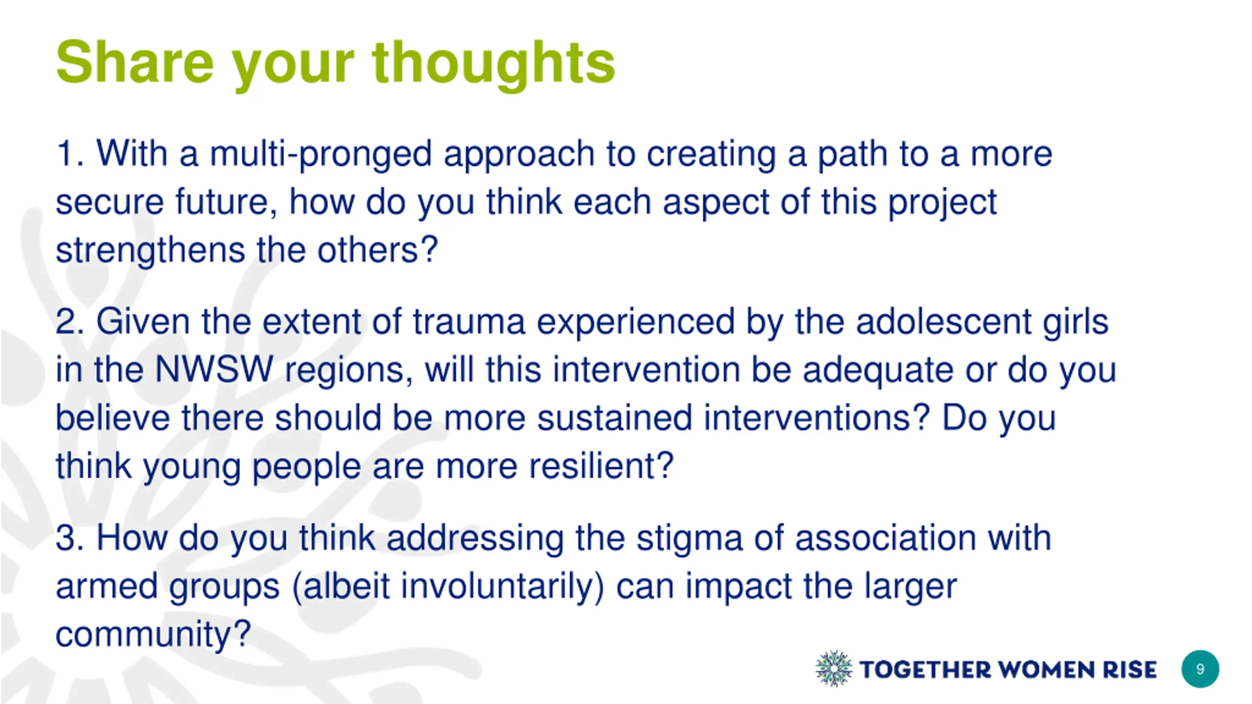 Share your thoughts 1. With a multi-pronged approach to creating a path to a more secure future, how do you think each aspect of this project strengthens the others? 2. Given the extent of trauma experienced by the adolescent girls in the NWSW regions, will this intervention be adequate or do you believe there should be more sustained interventions? Do you think young people are more resilient? 3. How do you think addressing the stigma of association with armed groups (albeit involuntarily) can impact the larger community? 9