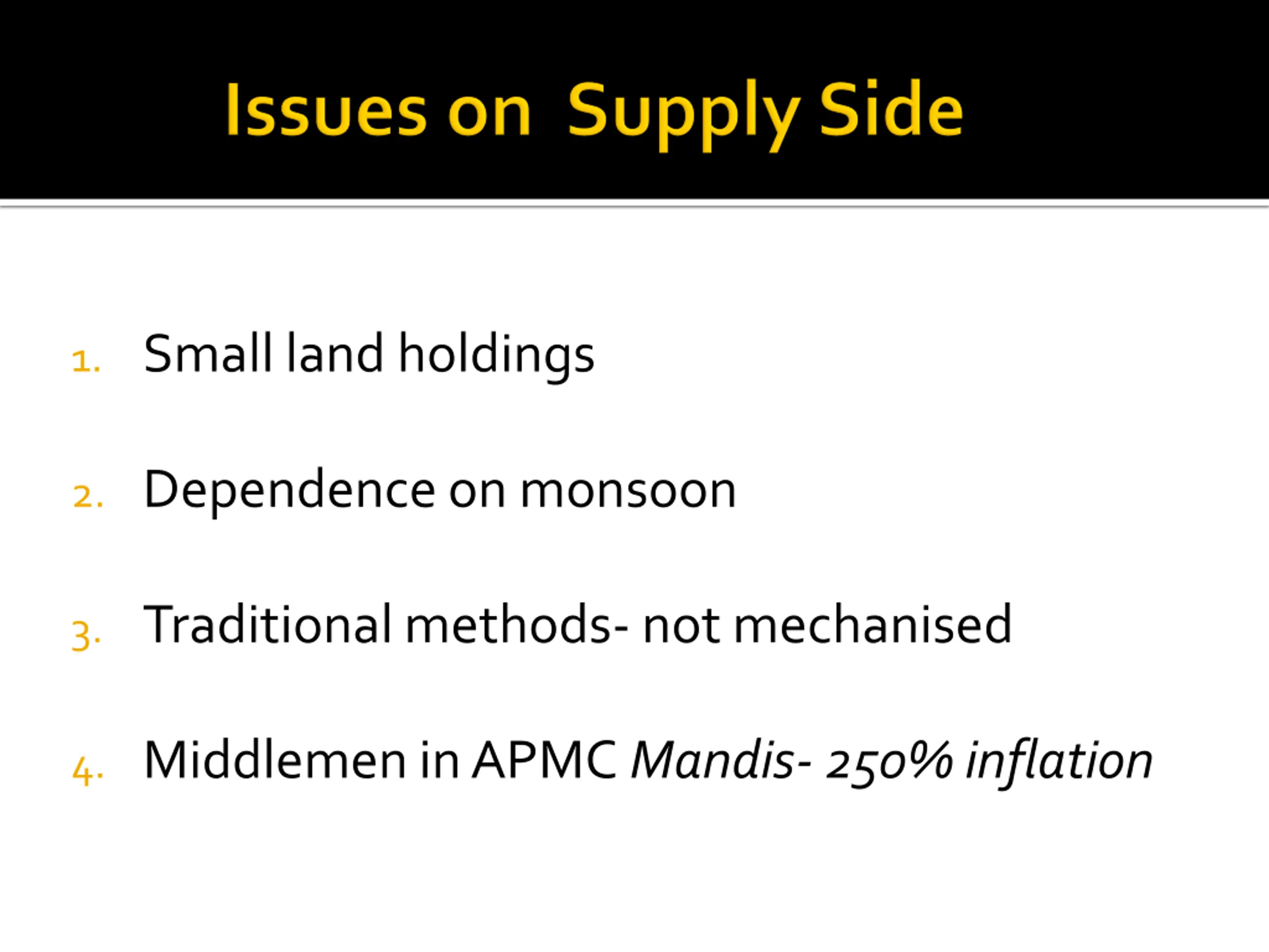 1. Small land holdings 2. Dependence on monsoon 3. Traditional methods- not mechanised 4. Middlemen in APMC Mandis- 250% inflation
