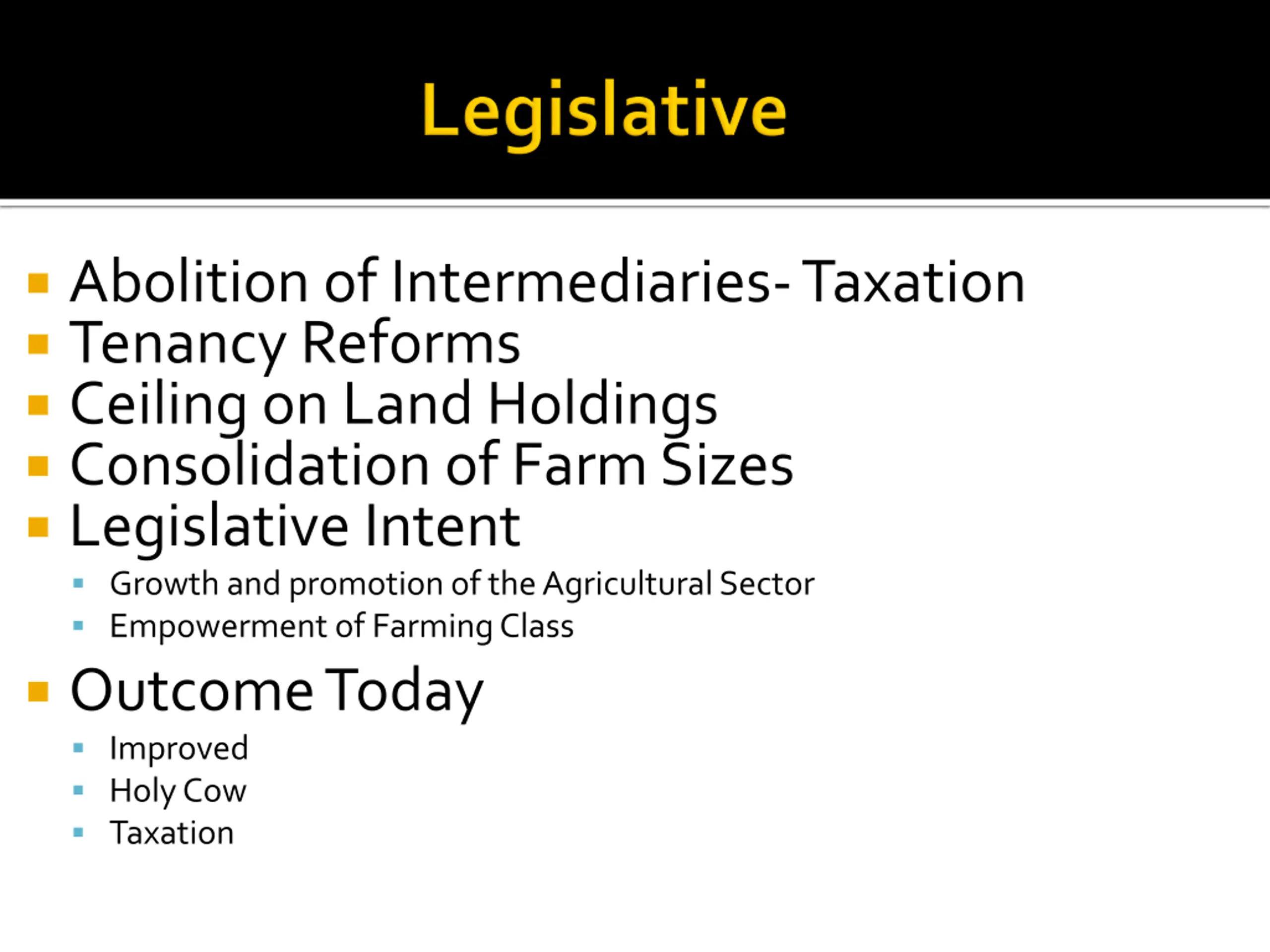 Abolition of Intermediaries- Taxation Tenancy Reforms Ceiling on Land Holdings Consolidation of Farm Sizes Legislative Intent Growth and promotion of the Agricultural Sector Empowerment of Farming Class Outcome Today Improved Holy Cow Taxation