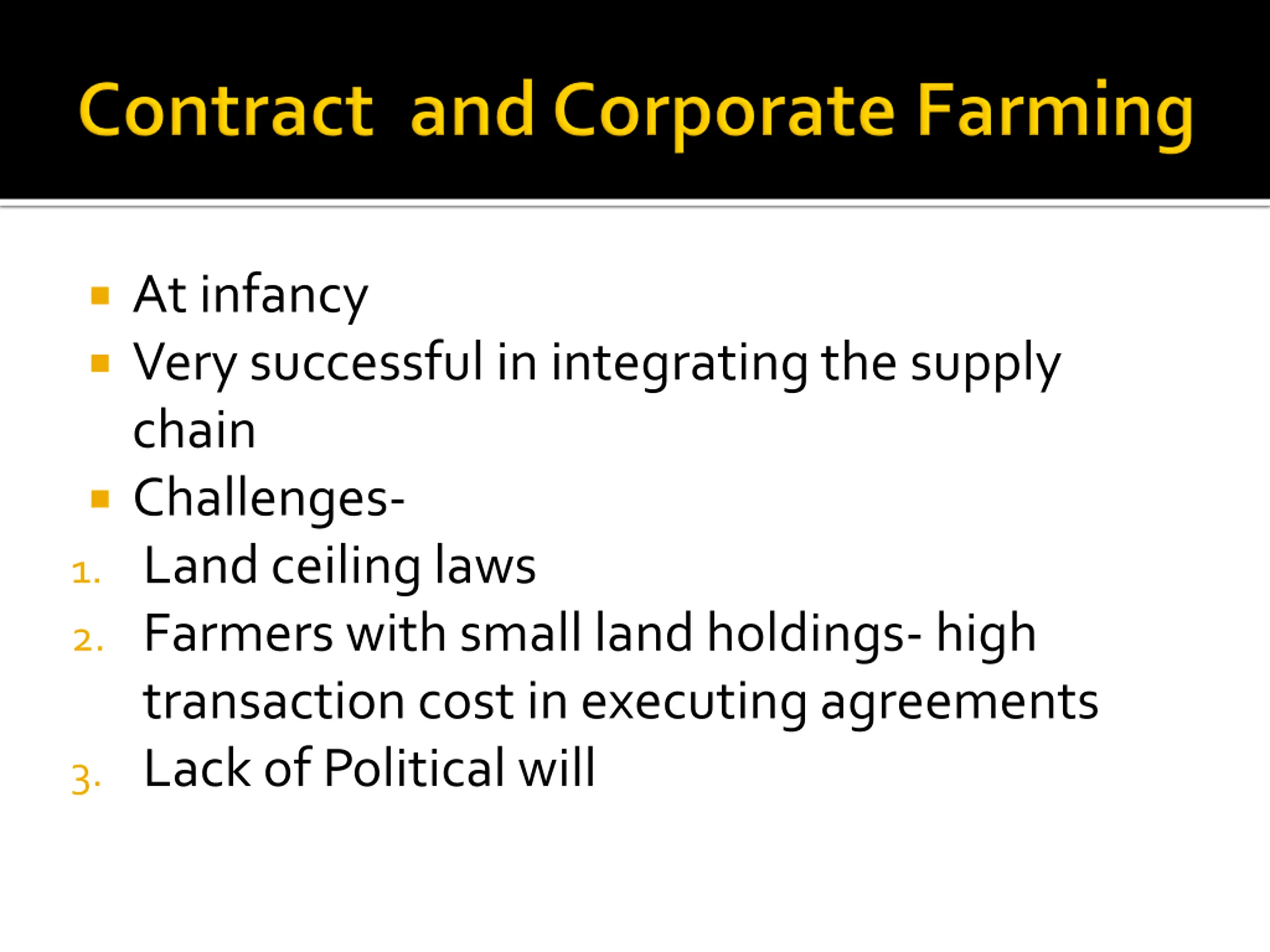 At infancy Very successful in integrating the supply chain Challenges- 1. Land ceiling laws 2. Farmers with small land holdings- high transaction cost in executing agreements 3. Lack of Political will