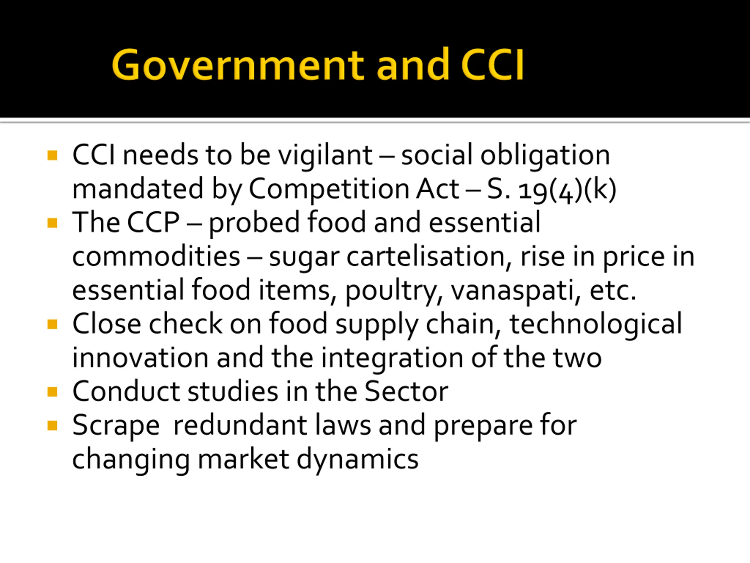 CCI needs to be vigilant social obligation mandated by Competition Act S. 19(4)(k) The CCP probed food and essential commodities sugar cartelisation, rise in price in essential food items, poultry, vanaspati, etc. Close check on food supply chain, technological innovation and the integration of the two Conduct studies in the Sector Scrape redundant laws and prepare for changing market dynamics