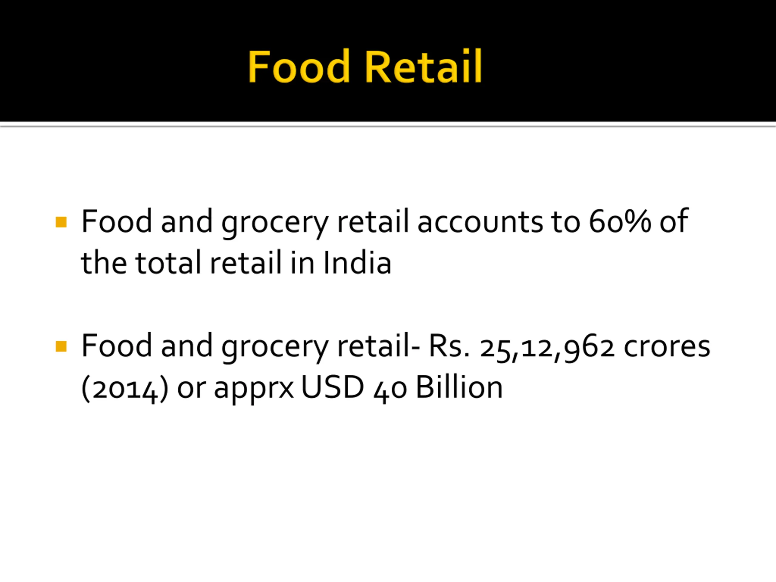 Food and grocery retail accounts to 60% of the total retail in India Food and grocery retail- Rs. 25,12,962 crores (2014) or apprx USD 40 Billion