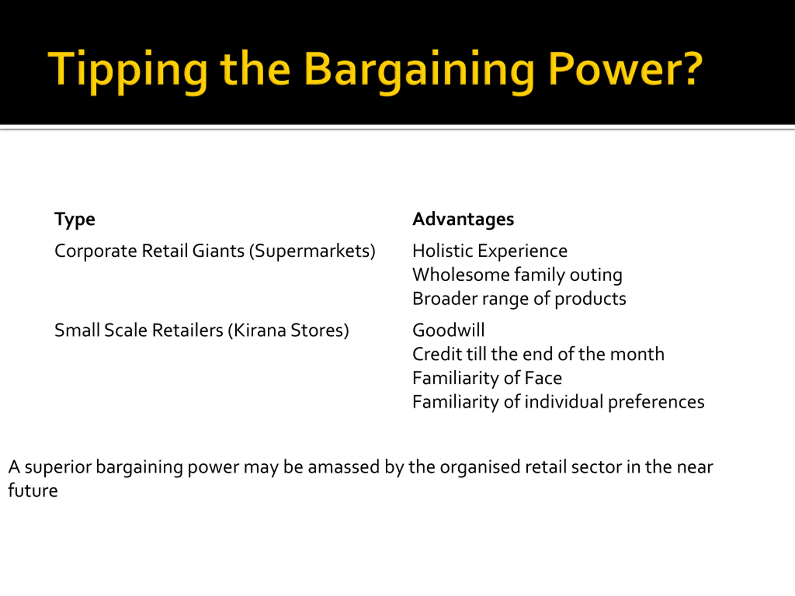 Type Advantages Corporate Retail Giants (Supermarkets) Holistic Experience Wholesome family outing Broader range of products Small Scale Retailers (Kirana Stores) Goodwill Credit till the end of the month Familiarity of Face Familiarity of individual preferences A superior bargaining power may be amassed by the organised retail sector in the near future