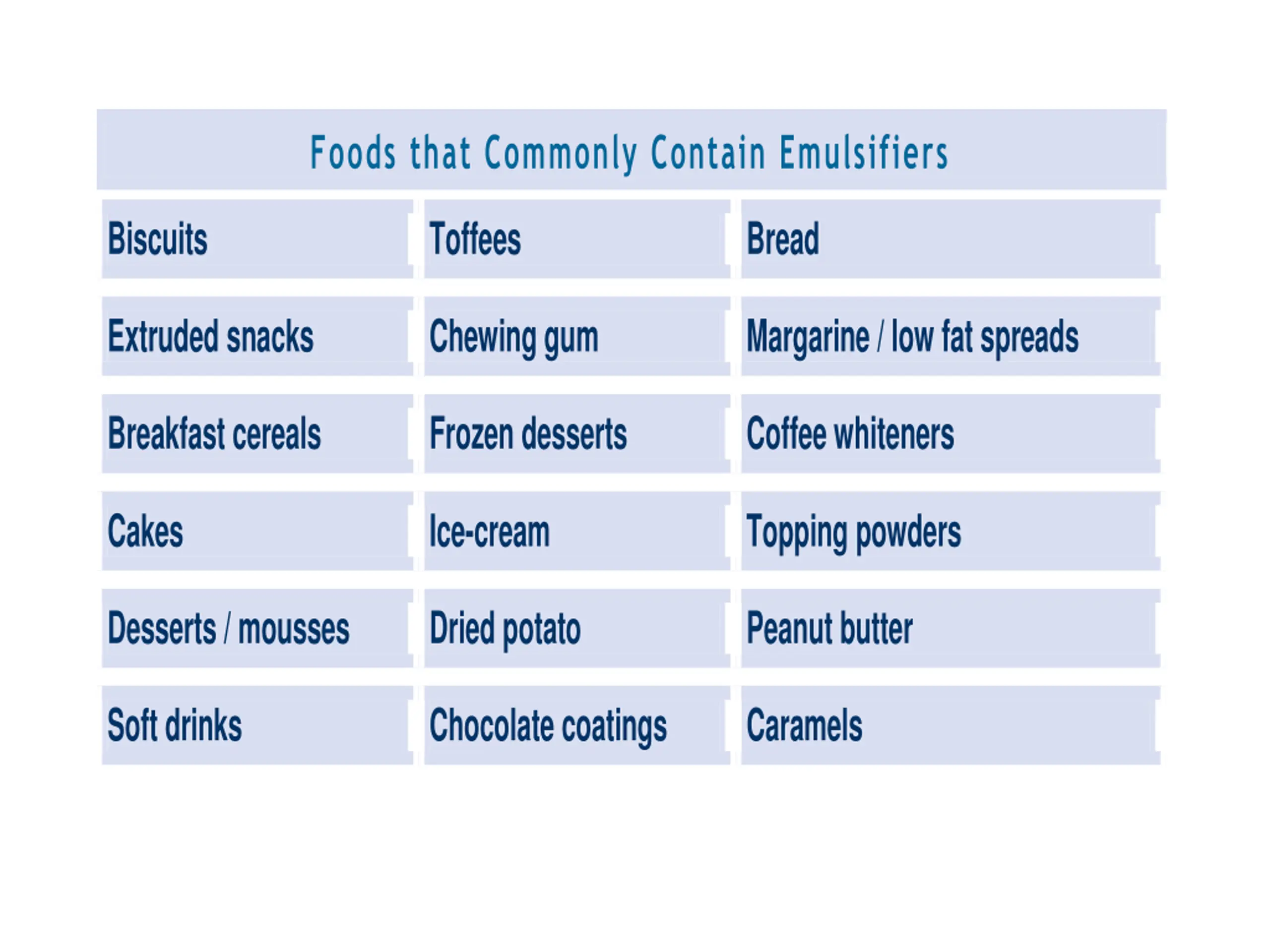 Foods that Commonly Contain Emulsifiers Biscuits Toffees Bread Extruded snacks Chewing gum Margarine / low fat spreads Breakfast cereals Frozen desserts Coffee whiteners Cakes Ice-cream Topping powders Desserts / mousses Dried potato Peanut butter Soft drinks Chocolate coatings Caramels