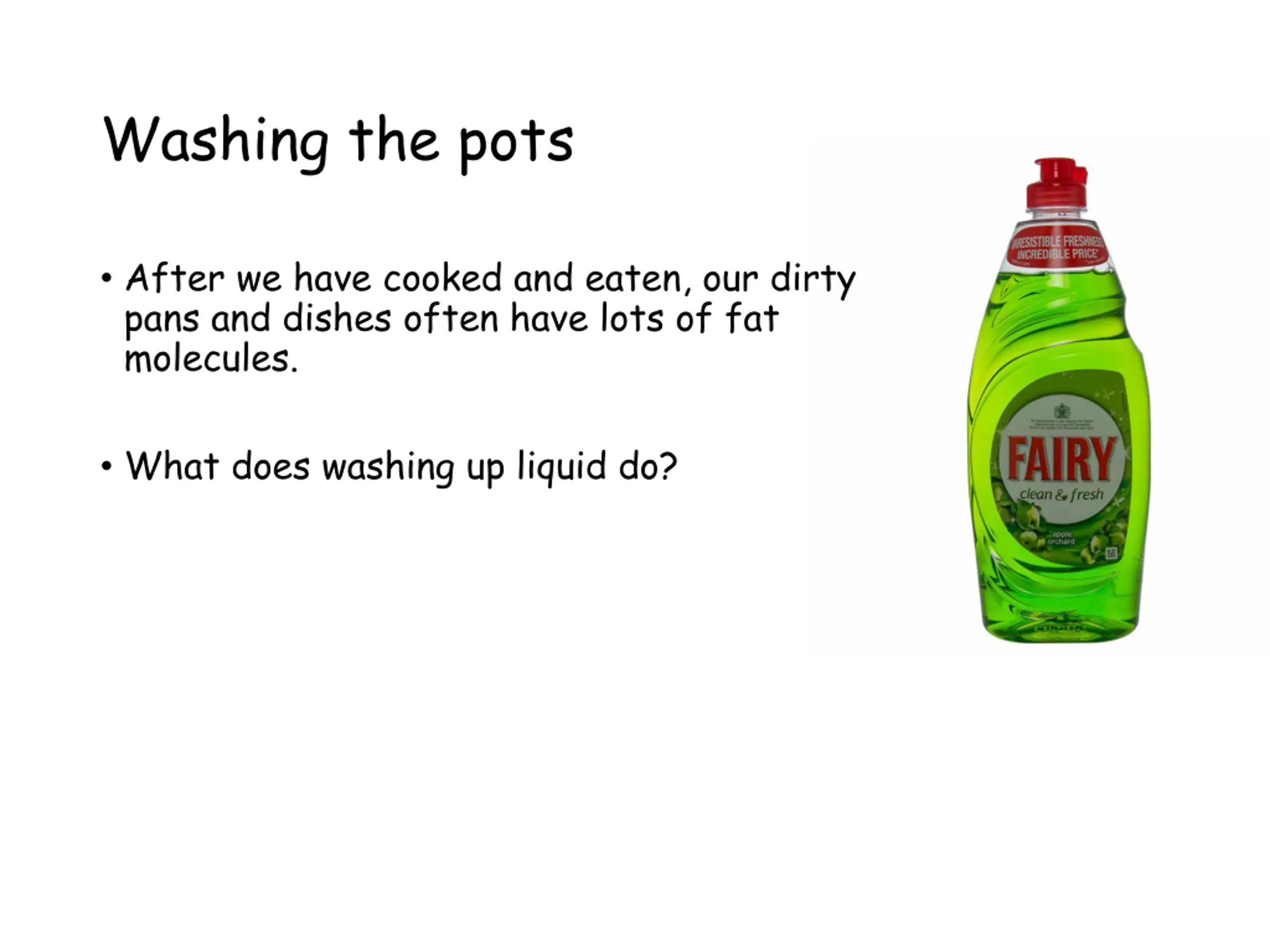 Washing the pots After we have cooked and eaten, our dirty pans and dishes often have lots of fat molecules. What does washing up liquid do?