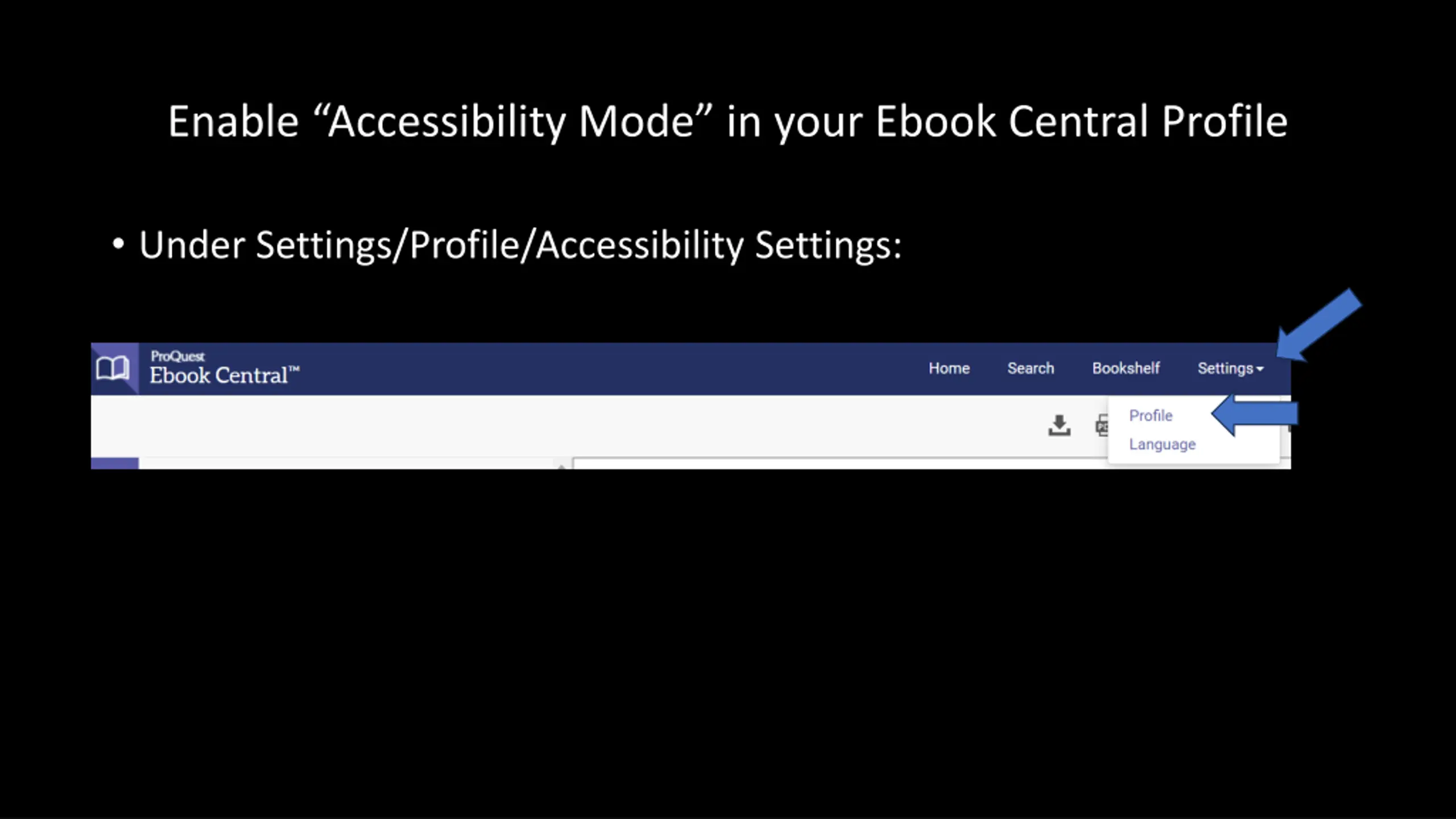 Enable Accessibility Mode in your Ebook Central Profile Under Settings/Profile/Accessibility Settings: