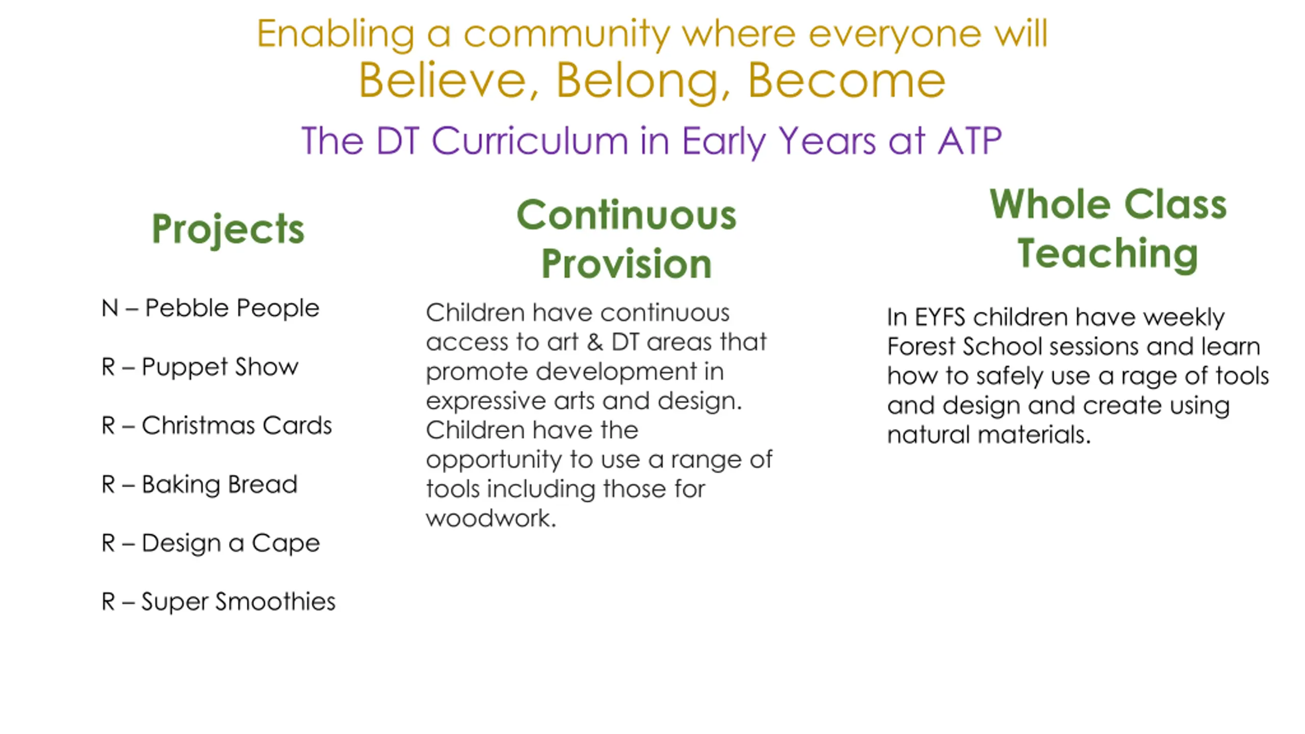Enabling a community where everyone will Believe, Belong, Become The DT Curriculum in Early Years at ATP Whole Class Teaching Continuous Provision Children have continuous access to art & DT areas that promote development in expressive arts and design. Children have the opportunity to use a range of tools including those for woodwork. Projects N Pebble People In EYFS children have weekly Forest School sessions and learn how to safely use a rage of tools and design and create using natural materials. R Puppet Show R Christmas Cards R Baking Bread R Design a Cape R Super Smoothies