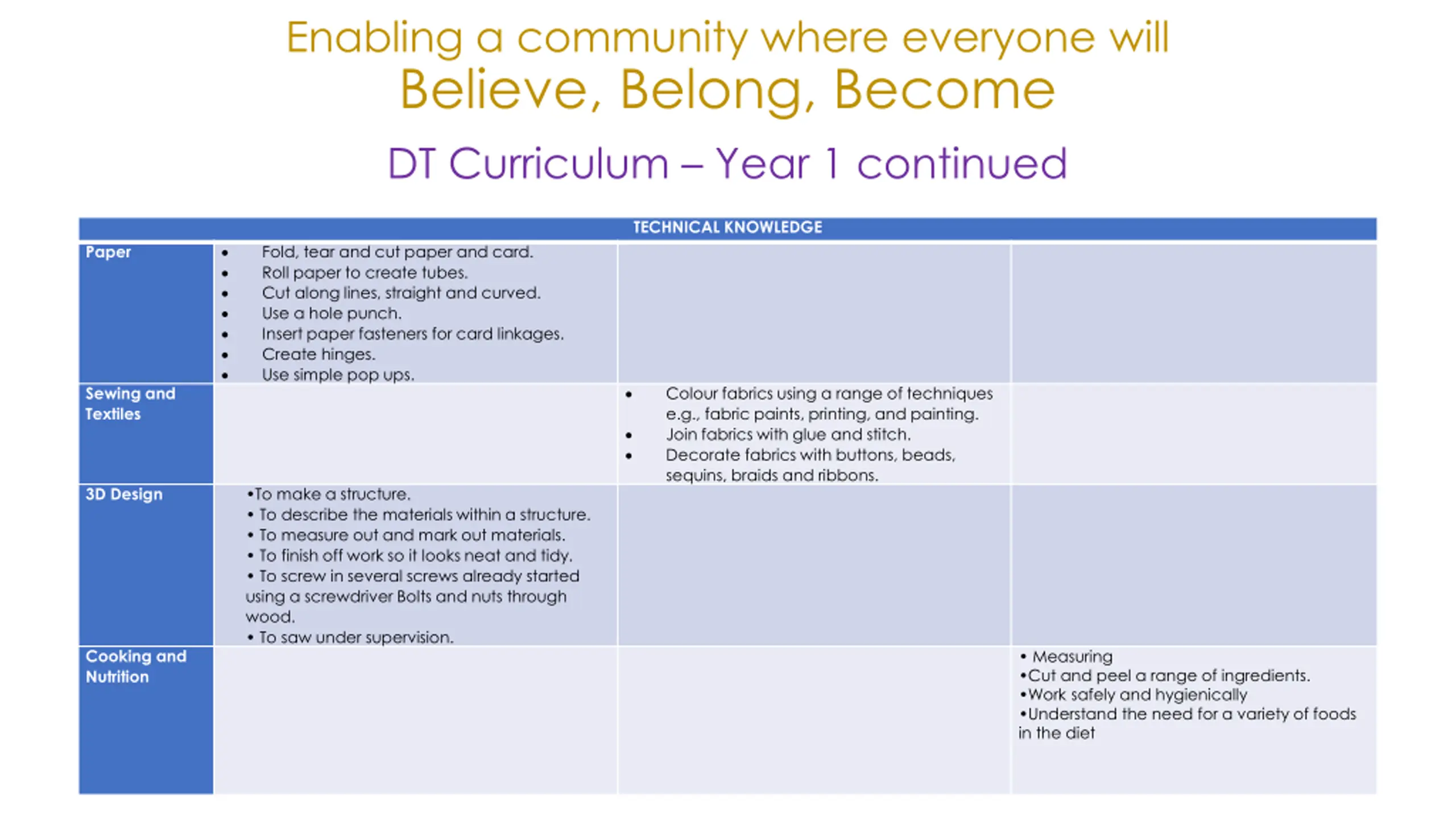 Enabling a community where everyone will Believe, Belong, Become DT Curriculum Year 1 continued TECHNICAL KNOWLEDGE Paper Fold, tear and cut paper and card. Roll paper to create tubes. Cut along lines, straight and curved. Use a hole punch. Insert paper fasteners for card linkages. Create hinges. Use simple pop ups. Sewing and Textiles Colour fabrics using a range of techniques e.g., fabric paints, printing, and painting. Join fabrics with glue and stitch. Decorate fabrics with buttons, beads, sequins, braids and ribbons. 3D Design To make a structure. To describe the materials within a structure. To measure out and mark out materials. To finish off work so it looks neat and tidy. To screw in several screws already started using a screwdriver Bolts and nuts through wood. To saw under supervision. Cooking and Nutrition Measuring Cut and peel a range of ingredients. Work safely and hygienically Understand the need for a variety of foods in the diet