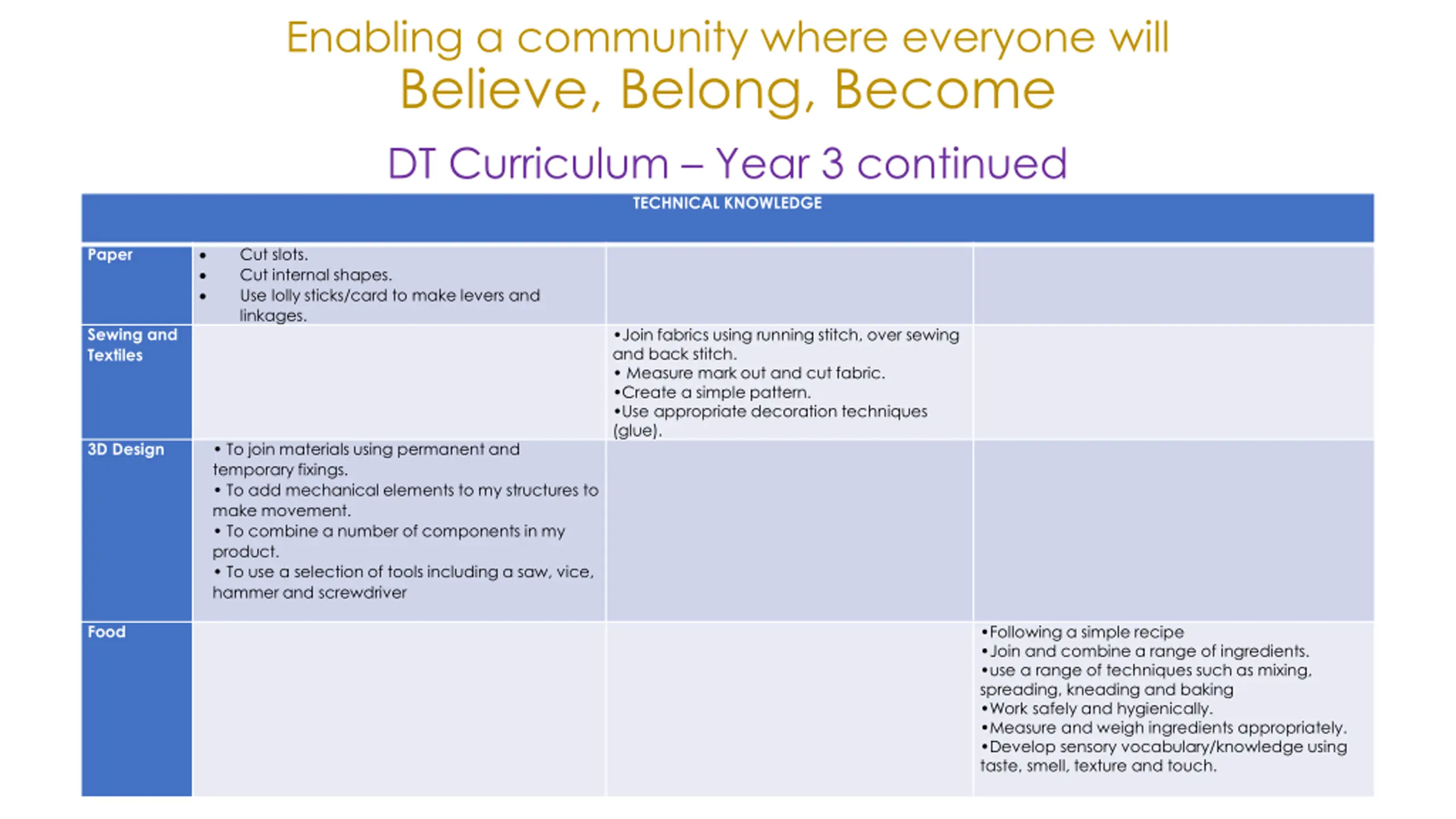Enabling a community where everyone will Believe, Belong, Become DT Curriculum Year 3 continued TECHNICAL KNOWLEDGE Paper Cut slots. Cut internal shapes. Use lolly sticks/card to make levers and linkages. Sewing and Textiles Join fabrics using running stitch, over sewing and back stitch. Measure mark out and cut fabric. Create a simple pattern. Use appropriate decoration techniques (glue). 3D Design To join materials using permanent and temporary fixings. To add mechanical elements to my structures to make movement. To combine a number of components in my product. To use a selection of tools including a saw, vice, hammer and screwdriver Food Following a simple recipe Join and combine a range of ingredients. use a range of techniques such as mixing, spreading, kneading and baking Work safely and hygienically. Measure and weigh ingredients appropriately. Develop sensory vocabulary/knowledge using taste, smell, texture and touch.
